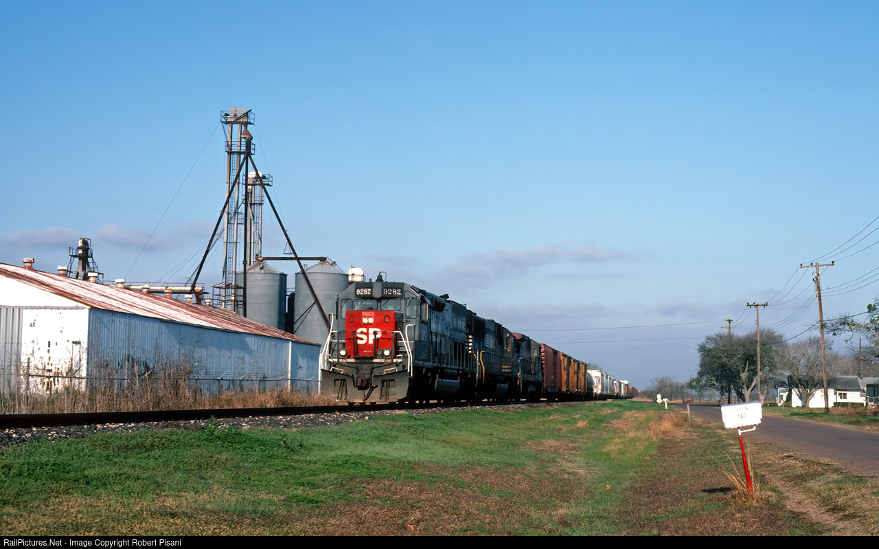 | SP 9282 west passes through the small community of Guadalupe just south of Victoria, TX on what had been Southern Pacific's Port Lavaca Subdivision. This line was previously part of the Galveston, Harrisburg & San Antonio Railway which itself was a subsidiary of SP. It all belonged to Union Pacific by this point in time. I believe this line is now UP's Cuero Sub. The industry at left is long gone, with the property now part of an expanded US-87 highway. |