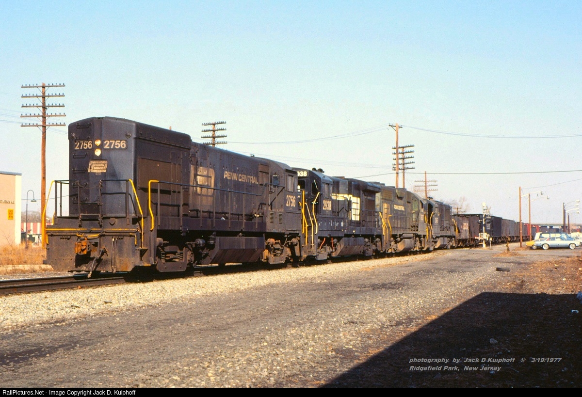 | PC, Penn Central U23B 2755-U33B 2938- GP387837- U25B 2565 with VE-1 southbound on the ex-NYC River Line at Ridgefield Park, New Jersey. March 19, 1977. Jack D Kuiphoff © photo