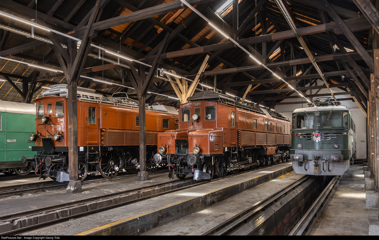 On July 6, 2024, SBB Historic opened an exhibition on the history of the Gotthard Railway in Erstfeld in the old, renovated steam shed from 1881. Part of the exhibition includes 4 important electric locomotives, from left to right: Passenger train locomotive Be 4/6 # 12332 from 1922 from a series of 40 locomotives built. Freight train locomotive prototype "Köfferlilok" or "grandmother" Ce 6/8 I # 14201, built in 1919, predecessor of the crocodile locomotives. Far right Ae 6/6 # 11402 "Uri" from 1952. This locomotive is operational and is operated by the Erstfeld Historical Locomotives at the Gotthard Association, the others are no longer operational.