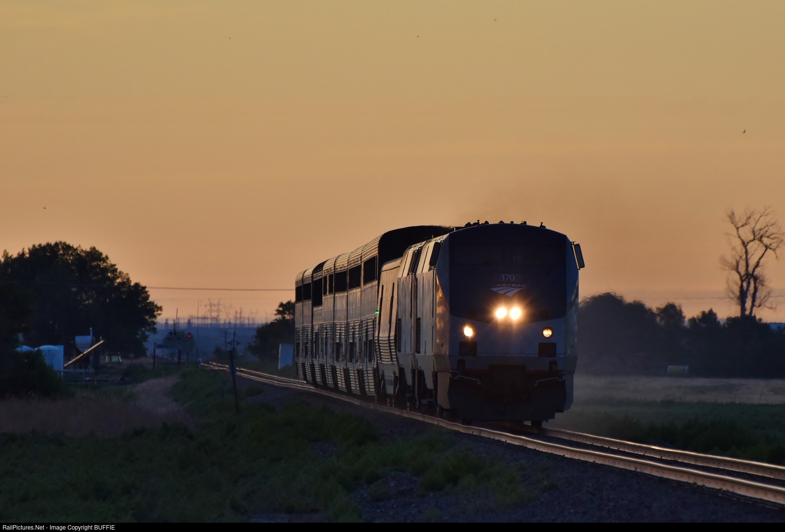 Amtrak engine #170 (P42DC) leads the California Zephyr at sunrise through Fort Morgan, Colorado.