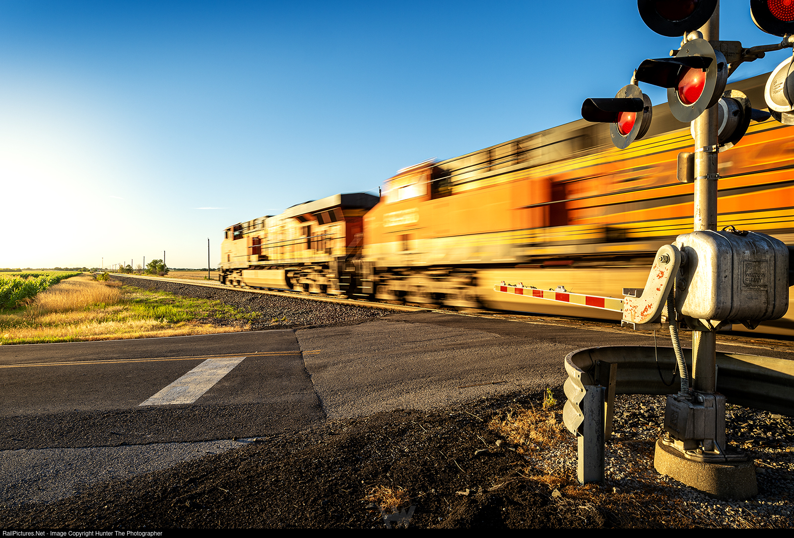 | A pair of ES44ACs from the BNSF lead a northbound train of empty coal hoppers across a road in Asbury, MO on the bright, golden evening of June 23, 2024.