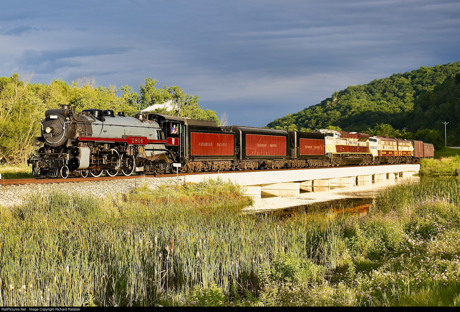 | After a long run up the CPKC Marquette subdivision, CP 2816 and train is approaching the River Line at La Crosse and will soon be able to stretch her legs at 50mph for the rest of the trip to St. Paul. But not before crossing a bridge in La Crescent during golden hour, a shot not possible if the train wasn't running 3 hours late at this point. |