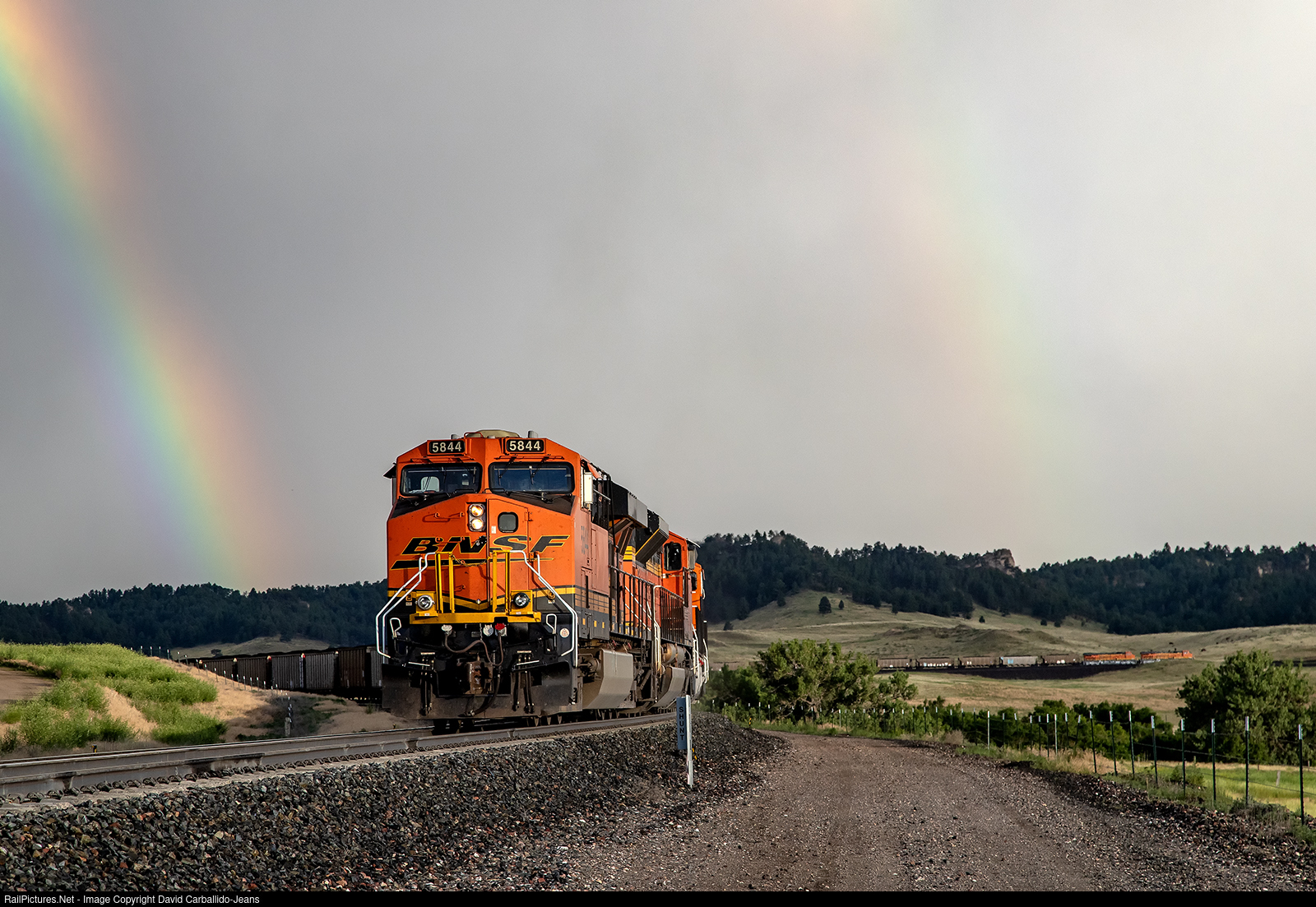 | The Crawford Helpers shove the rear of an eastbound coal load up the 1.7% grade of Crawford Hill as server thunderstorms move across northwestern Nebraska. As the helpers shove up against the DP motors of this Alabama Power coal train, the head consist can be seen climbing the grade. The leaders are BNSF 3317 and BNSF 3318, which are making their first eastbound trip over Crawford. They're BNSF's newest order of ES44ACH "Heavies" locomotives. |