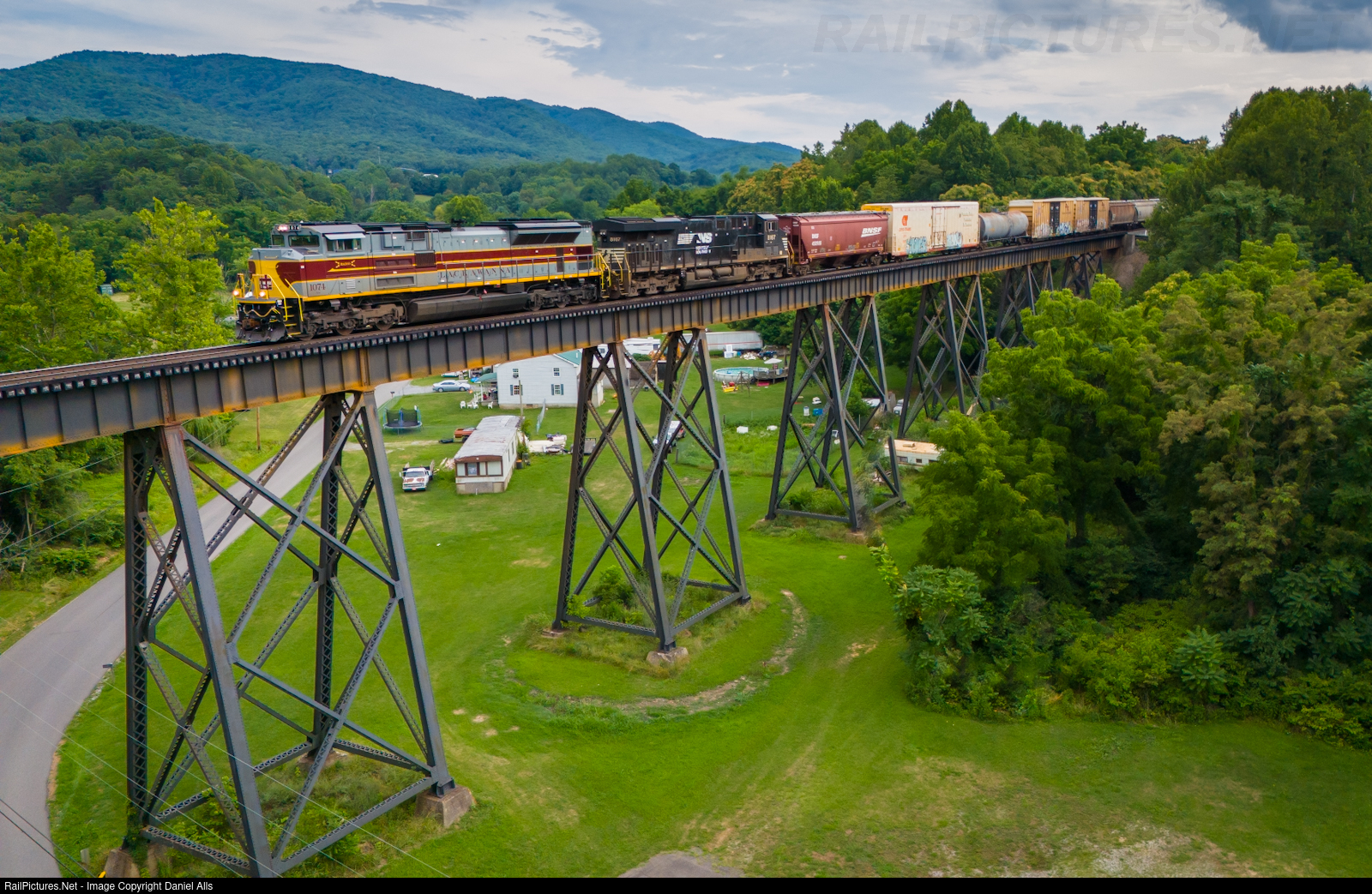 The still fresh after a paint job Lackawanna heritage unit leads a long NS 12Z north over the trestle in Troutville, VA.