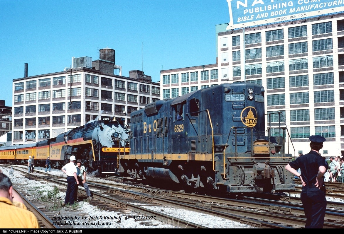 | B&O GP9 6529, and Chessie Steam Special, ex-Reading T1 2101 is at Philadelphia, PA. and is about ready for its return trip to Baltimore on its very first trip . I road this first trip, and chased the following day. Plenty of photos and movies this fantastic sunny weekend. June 14, 1977. Jack D Kuiphoff © photo |