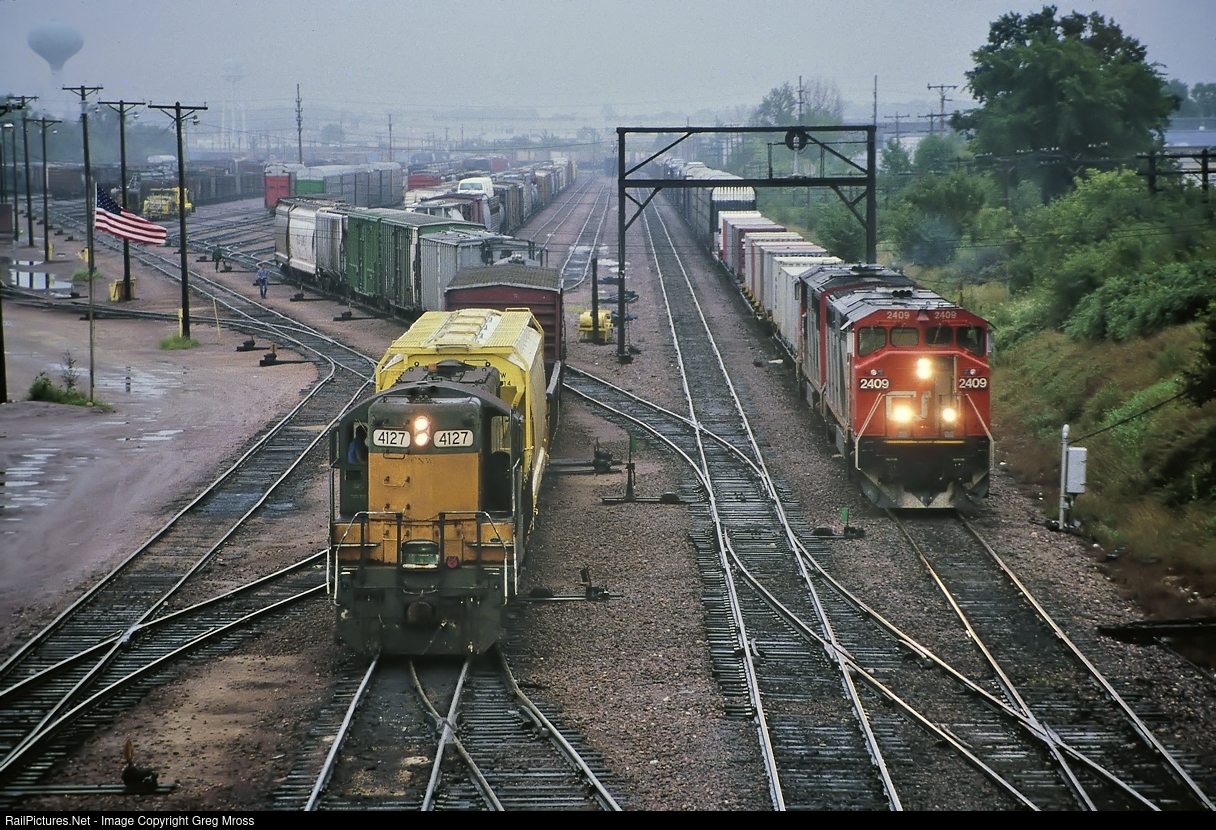 In August of 1990, Native Americans blocked both CN and CP tracks in Ontario, Canada. CN detoured several trains over the CNW from Chicago thru Wisconsin. Here we see a westbound detour train awaiting a crew change at Butler Yard while CNW 4127 does some switching. CN trains in Wisconsin were quite unusual in 1990, but are now an everyday sight. Unfortunately, Butler Yard is nowhere near as busy as it was in 1990.