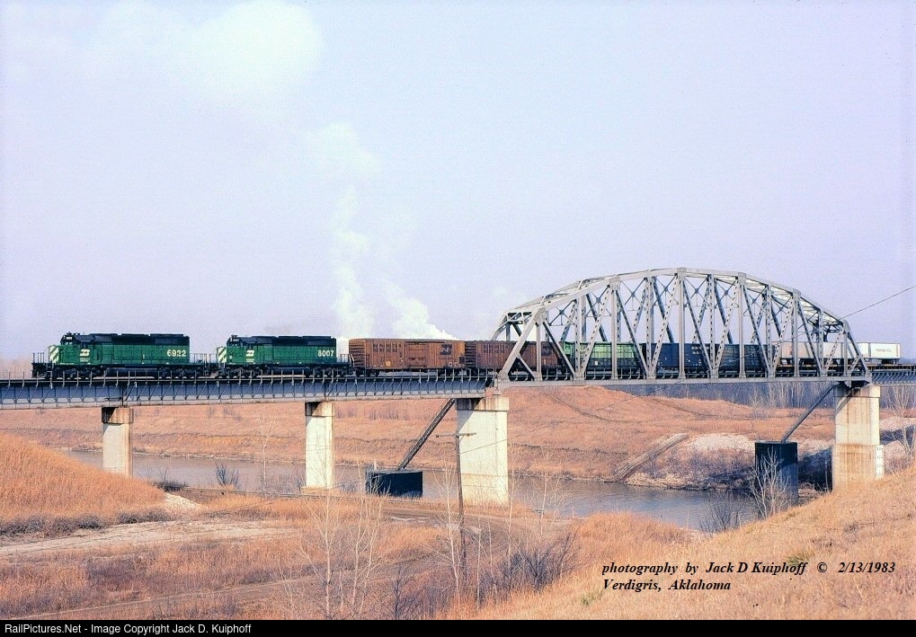 | BN, Burlington Northern SD40-2 6922 & 8007, on the ex-Frisco westbound, crossing the Verdigris River, at Verdigris, Oklahoma. February 13, 1983. Jack D Kuiphoff © photo |