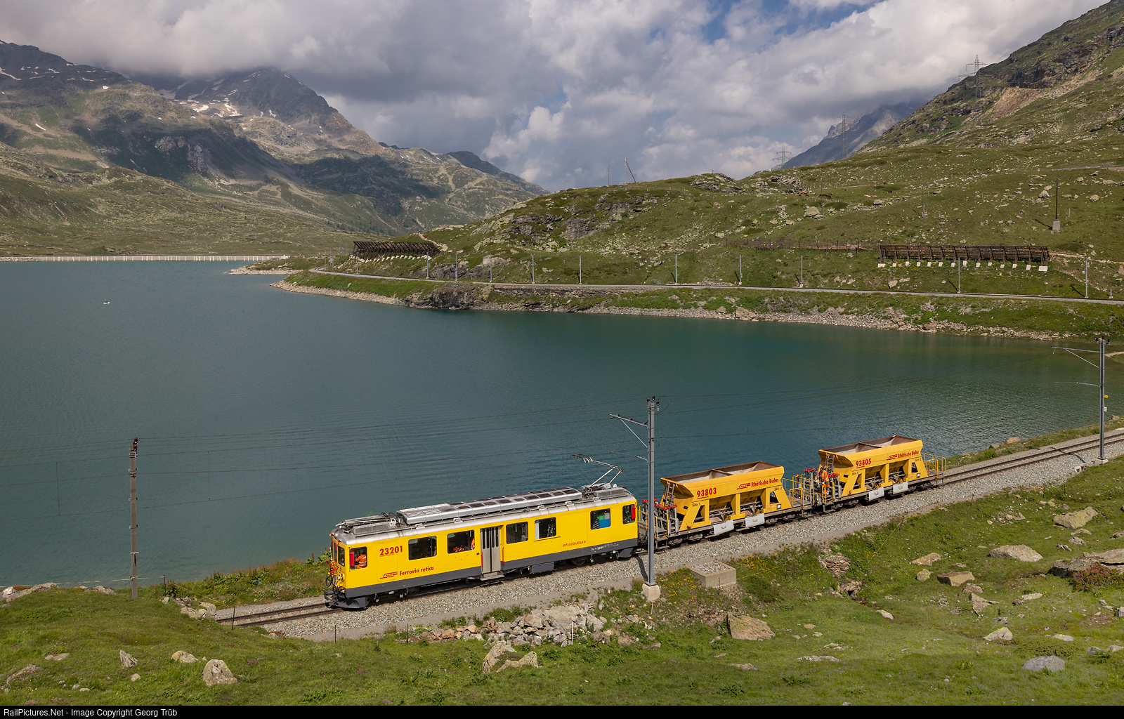 | Railcar Xe 4/4 # 23201 of the Rhaetian Railway infrastructure department is pulling two ballast cars along the Lago Bianco between Bernina Lagalb and Ospizio Bernina. This is former ABe 4/4 (Tw II) # 48 built in 1972 and used by the infrastructure since 2012. |