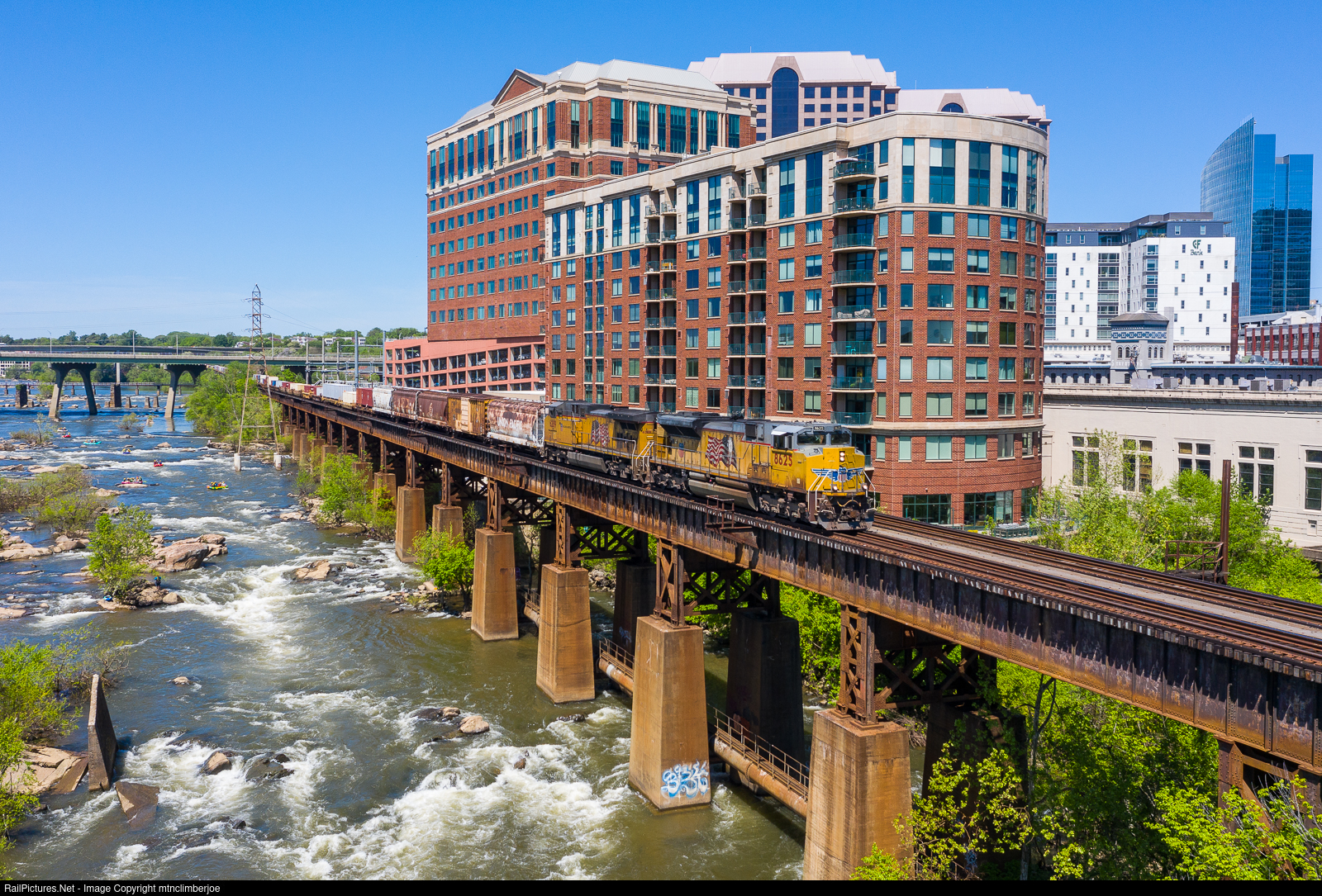 | With a pair of Union Pacific locomotives on the point, CSX train S836 rolls into Richmond, Virginia with a loaded DODX explosives train. The train is passing along the north bank of the of James River on a long trestle and will proceed into Fulton Yard. At the yard, a pusher crew will pull the train north through the junction to allow it to then go down the Bellwood Subdivision to head south. |