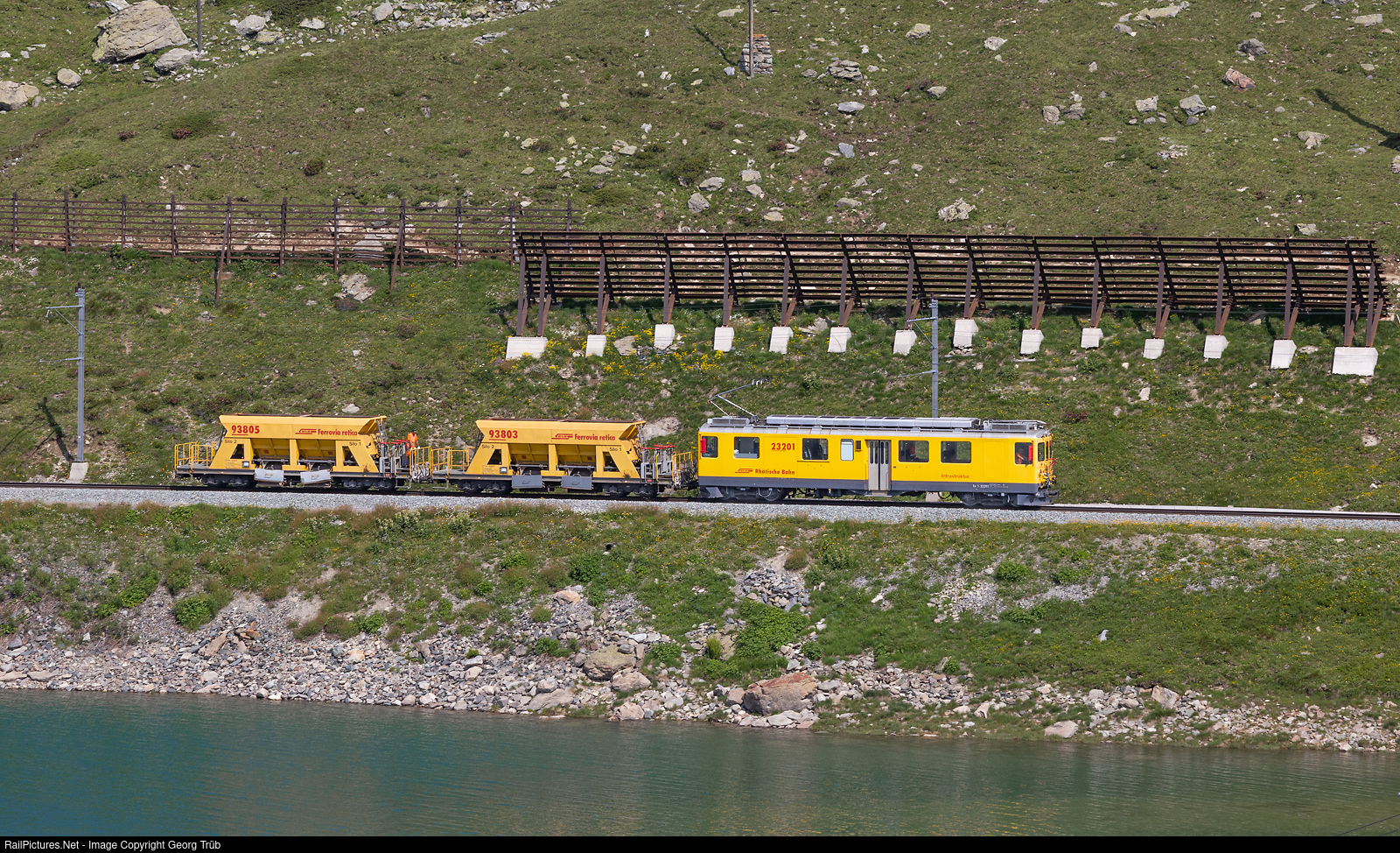 | Railcar Xe 4/4 # 23201 of the Rhaetian Railway infrastructure department is pulling two empty Xac-t ballast cars along the Lago Bianco between Bernina Lagalb and Ospizio Bernina. This is former railcar ABe 4/4 (Tw II) # 48 built in 1972 and used by the infrastructure since 2012. |