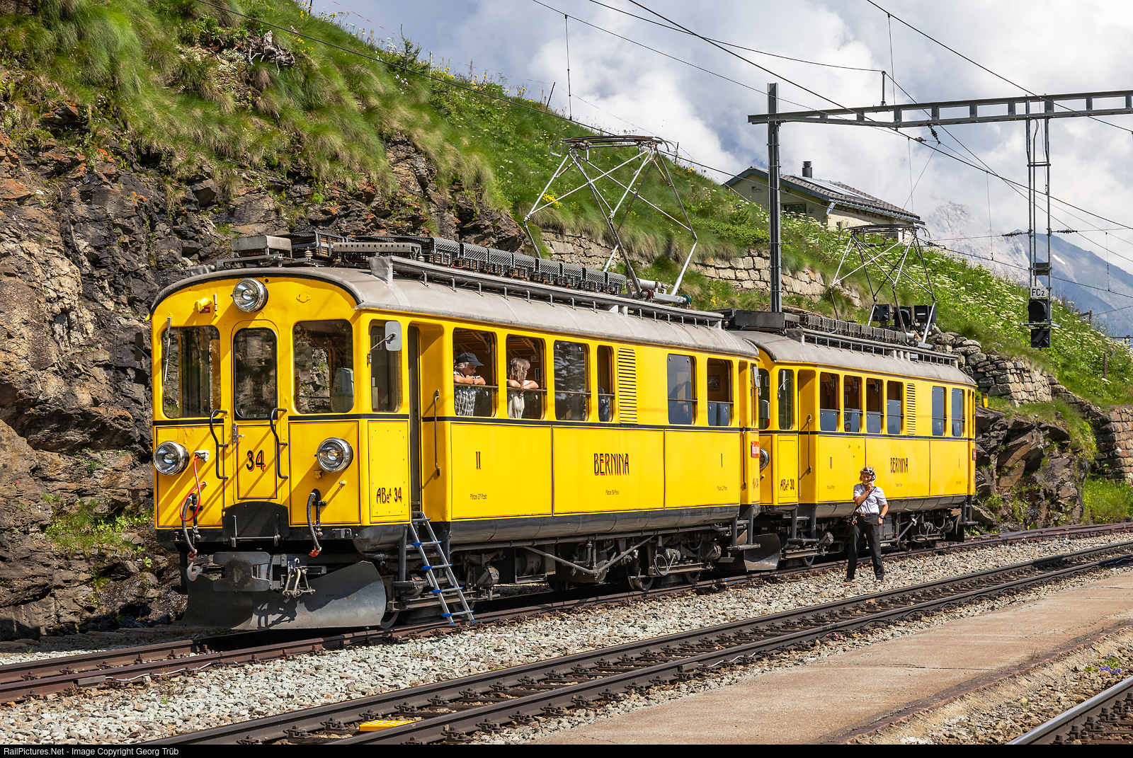 | Bernina Glaciers Adventure train 1639 of the Rhaetian Railway with railcars ABe 4/4 # 34 and # 30 (built 1908/1911 for the then independent Bernina Railway) is ready in Alp Grüm track 3 to run down back to Poschiavo. A mobile ladder has been fitted to one of the doors to make it easier to enter from track level. The train attendant telephones the RhB operations center in Landquart and reports that the train is ready to run. |
