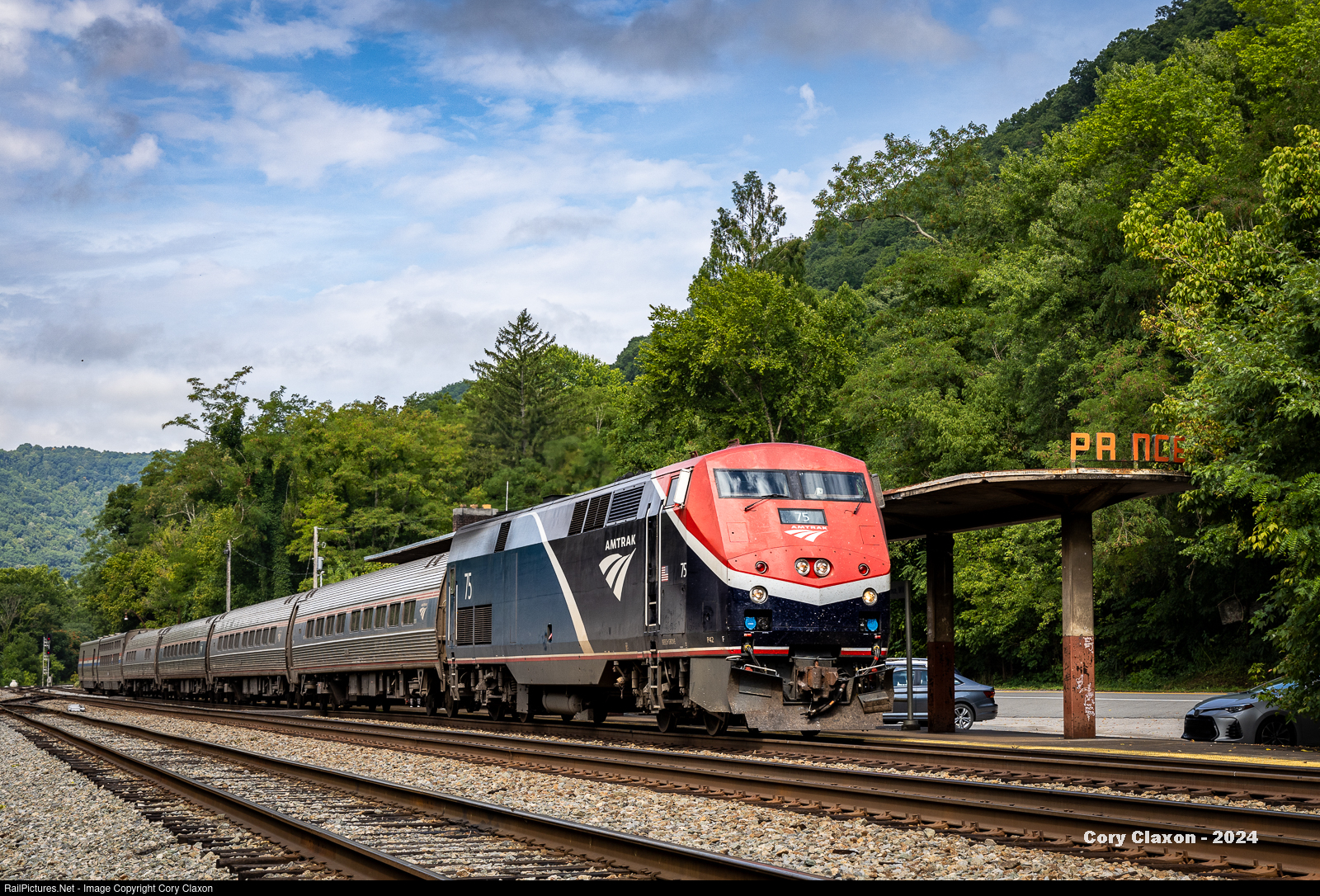 P42DC #75, in the new Phase VII scheme, is rolling to a stop at the art deco station of Prince, W.Va. This station has certainly seen better days. Years of lack of maintenance and TLC is starting to show, with the "I" missing off the top of the canopy here on the east end of the platform.
