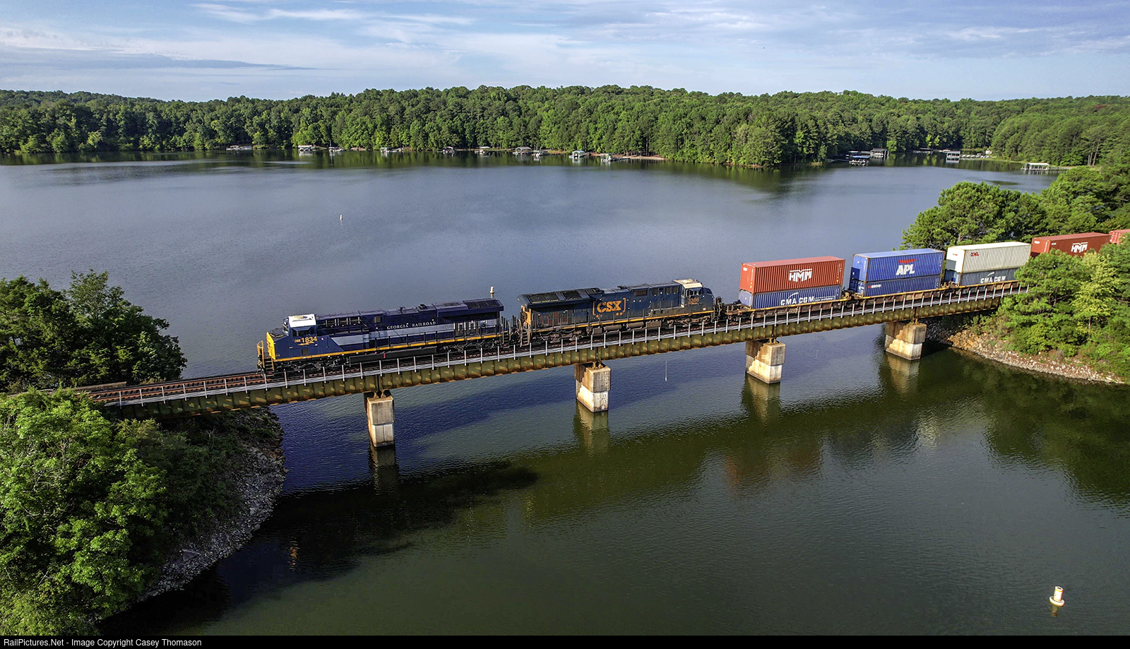 CSX's "Georgia Railroad" heritage unit leads train I12517 across West Point Lake near LaGrange, GA.