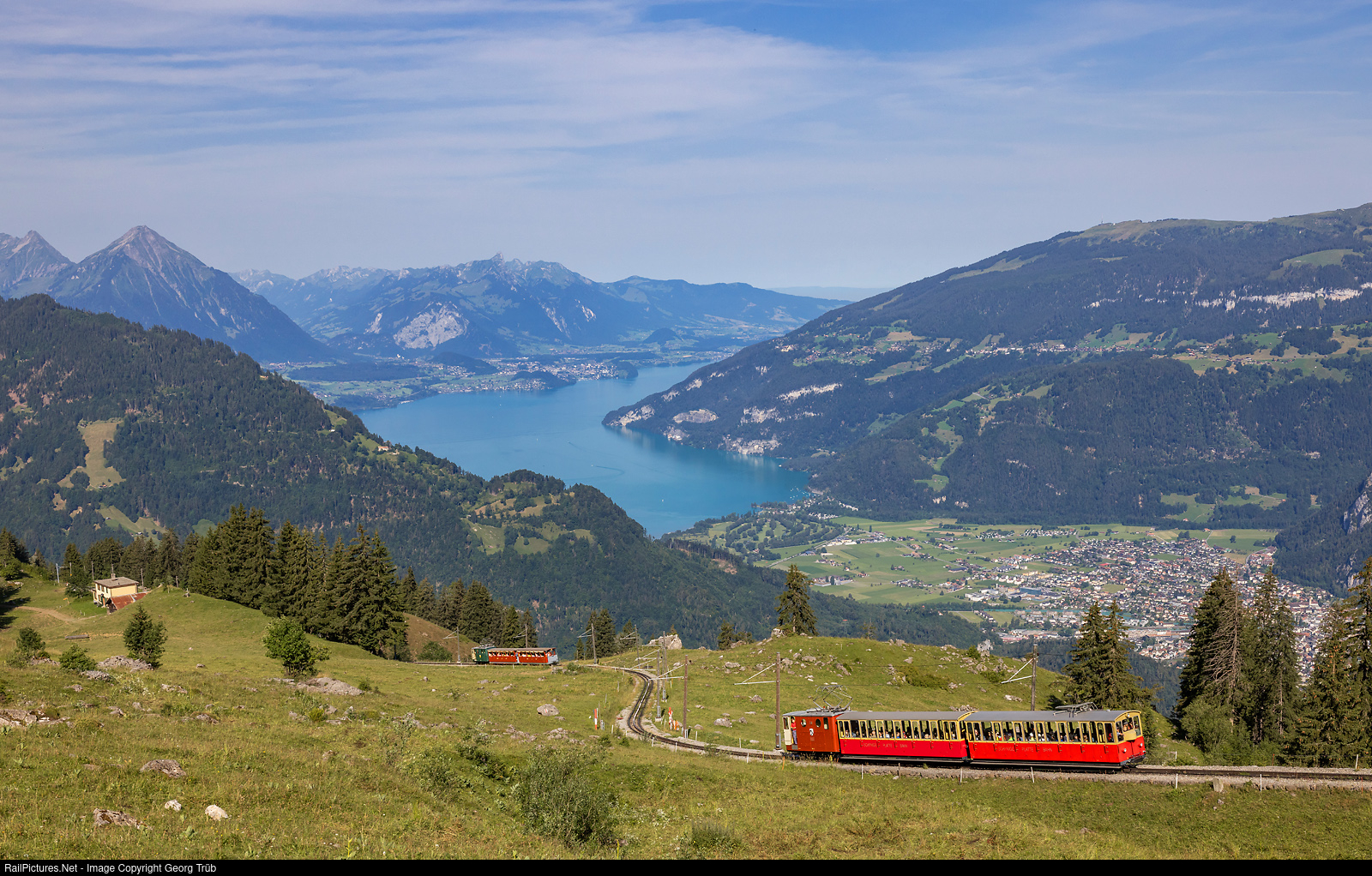 | Cogwheel locomotives He 2/2 # 18 "Gündlischwand" and # 61 "Enzian" of the Schynige Platte Bahn (SPB) are forming train 647 from Wilderswil to the Schynige Platte, above Breitlauenen. In the background the Lake Thun and Niesen mountain. On the left is Breitlauenen crossing station, on the right in the valley Unterseen and part of Interlaken. |