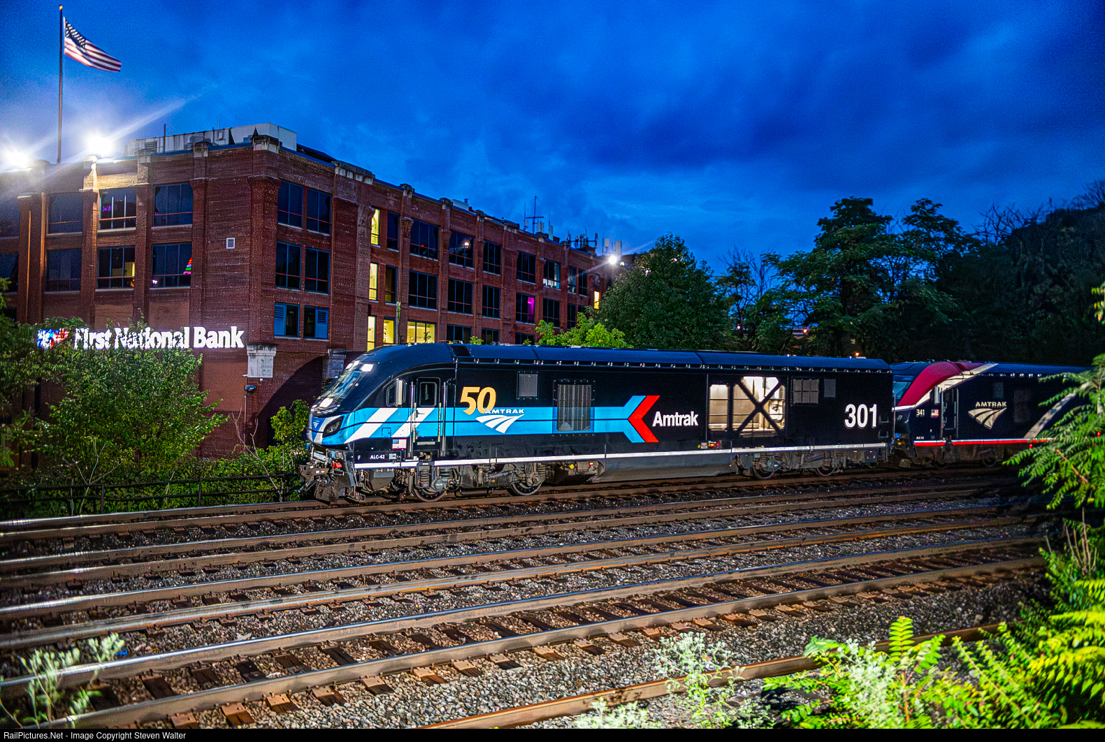 About 15 minutes before a cloudy sunrise, a slightly late Amtrak 30, led by Amtrak's "Day One" 50th Anniversary Heritage Unit rolls into Pittsburgh, passing through the North Shore.