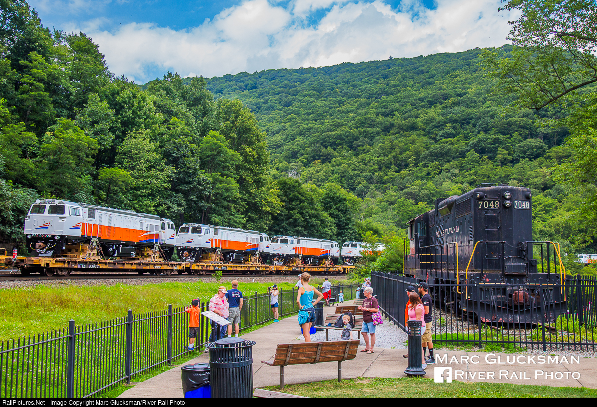 Moving Power. On August 8, 2015, a Norfolk Southern special move passed through Horseshoe Curve in Altoona Pennsylvania with a cargo of export locomotives from General Electric in Erie, Pennsylvania. EMD SD40E 6337 and SD60 6658 are seen with the 4 (red) Transnet (South Africa’s) GE ES40ACi and 9 (white) Indonesian Railways GE CM20EMP locomotives moving on flat cars, which will be delivered to the Port of Baltimore, Maryland to be transferred to ships. The scene is framed by EMDs as the train passes the stationary display of ex-Pennsylvania Railroad (PRR) GP9 7048 (12/1955), a resident of the park since shortly after PRR K4 1361 was removed for restoration in 1985.
