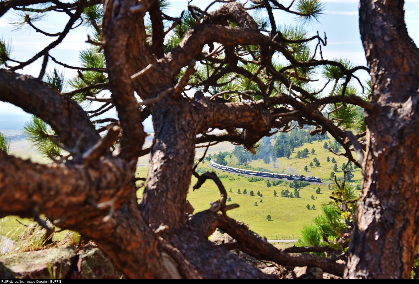 The Rocky Mountaineer is spotted through the trees rounding the base of Blue Mountain at Coal Creek Canyon, Colorado.