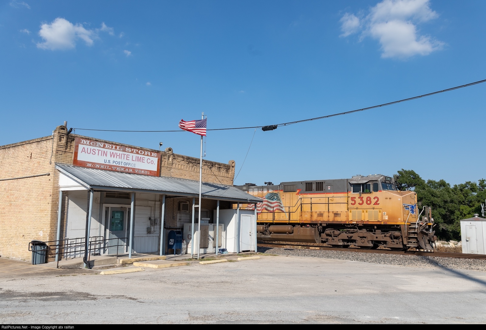 A southbound rock train passes the historic McNeil Post Office and Austin White Lime general store. Founded in 1888, Austin White Lime operated for 135 years until its closure on March 31st, 2024. The future of the site is uncertain, but for now the post office remains open, a reminder of a bygone time when McNeil was a company town home to several hundred plant workers.
