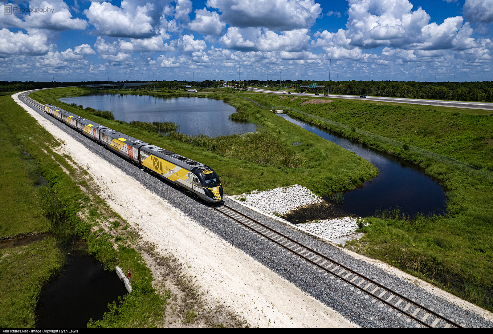About to pass under Florida Highway 528, a Brightline Trainset is seen under a Cloudy Warm Summer Day.