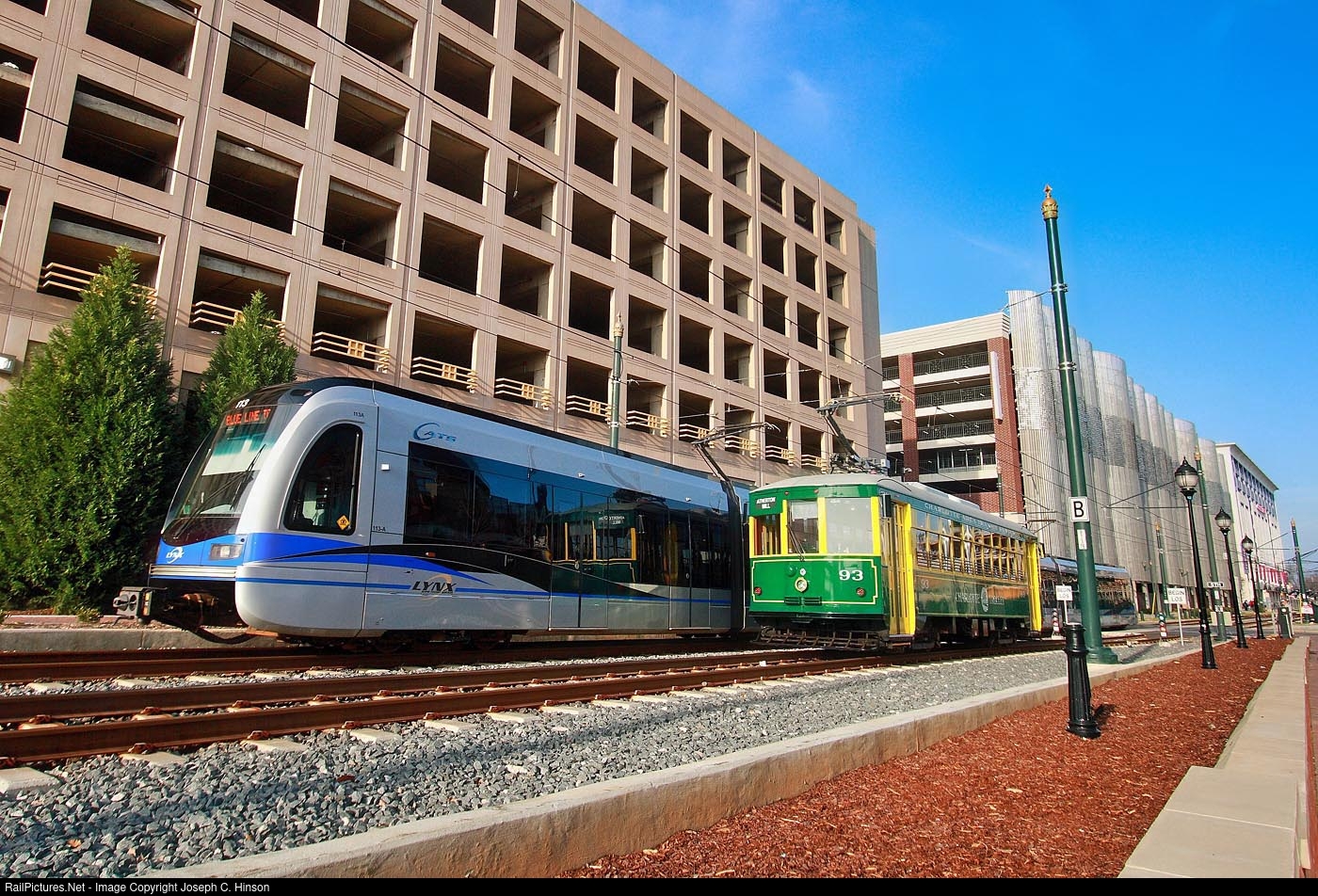 | The Blue Line runs partly on former Southern Railway roadbed which was abandoned in the 1950s when that railroad opened a new line away from the downtown area. In 2016, an extension opened to the UNCC campus north of town. CATS 92, the replica trolley car seen here, was sold to Memphis Transit Authority a few years ago. |