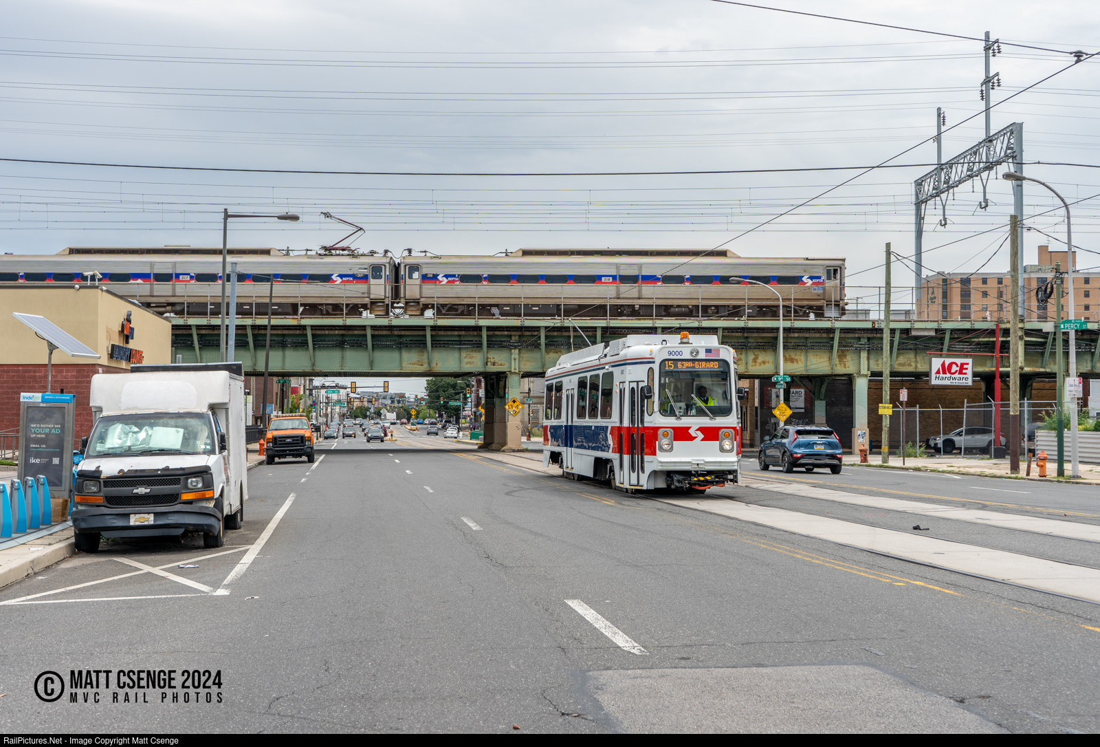 Southeastern Pennsylvania Transportation Authority (SEPTA) Type K car 9000 is seen on Girard Ave at N Percy St, with Warminster Line train 433 passing overhead on the Regional Rail viaduct.