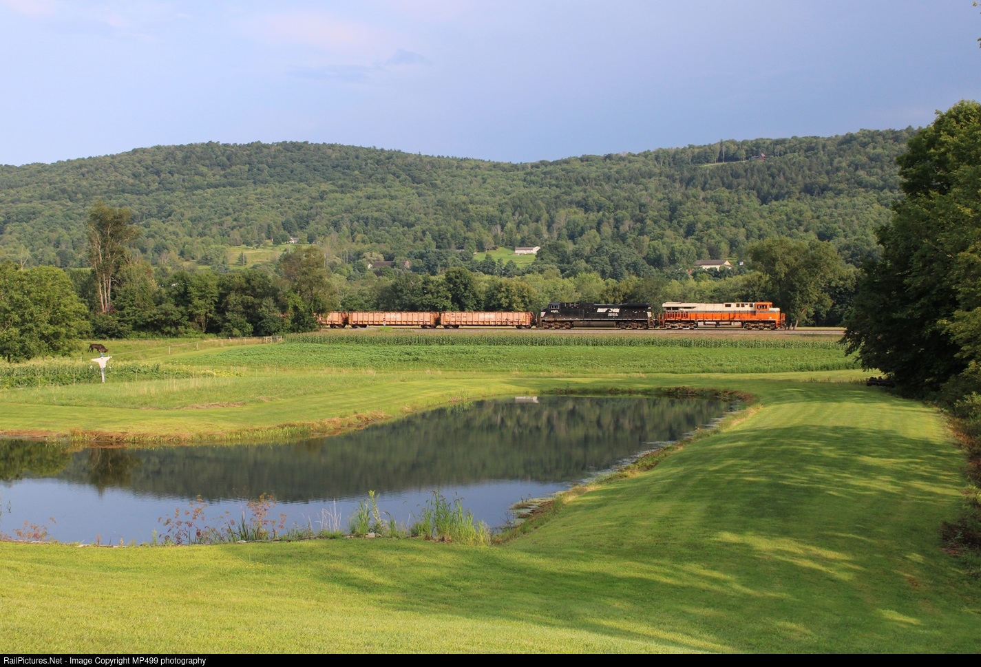 NS 30T crawls south on the D&H as it passes a small pond in Otego with the Interstate heritage unit leading. The train was running at restricted speed due to signal issues.