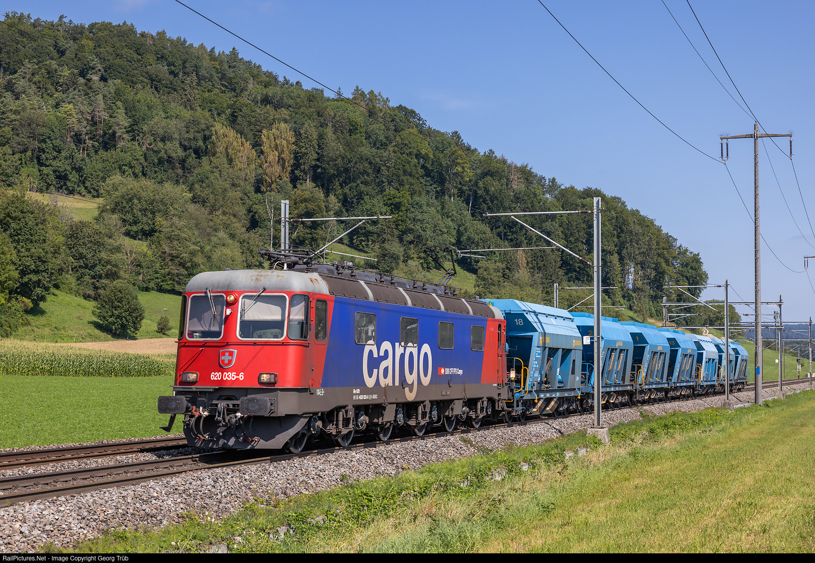 | Re 620 # 035 (Re 6/6 # 11635) of the SBB pulls the loaded HASTAG gravel train 67551 from Hüntwangen-Wil via Bülach-Winterthur-Gossau SG to Arnegg, between Eglisau and Glattfelden. |