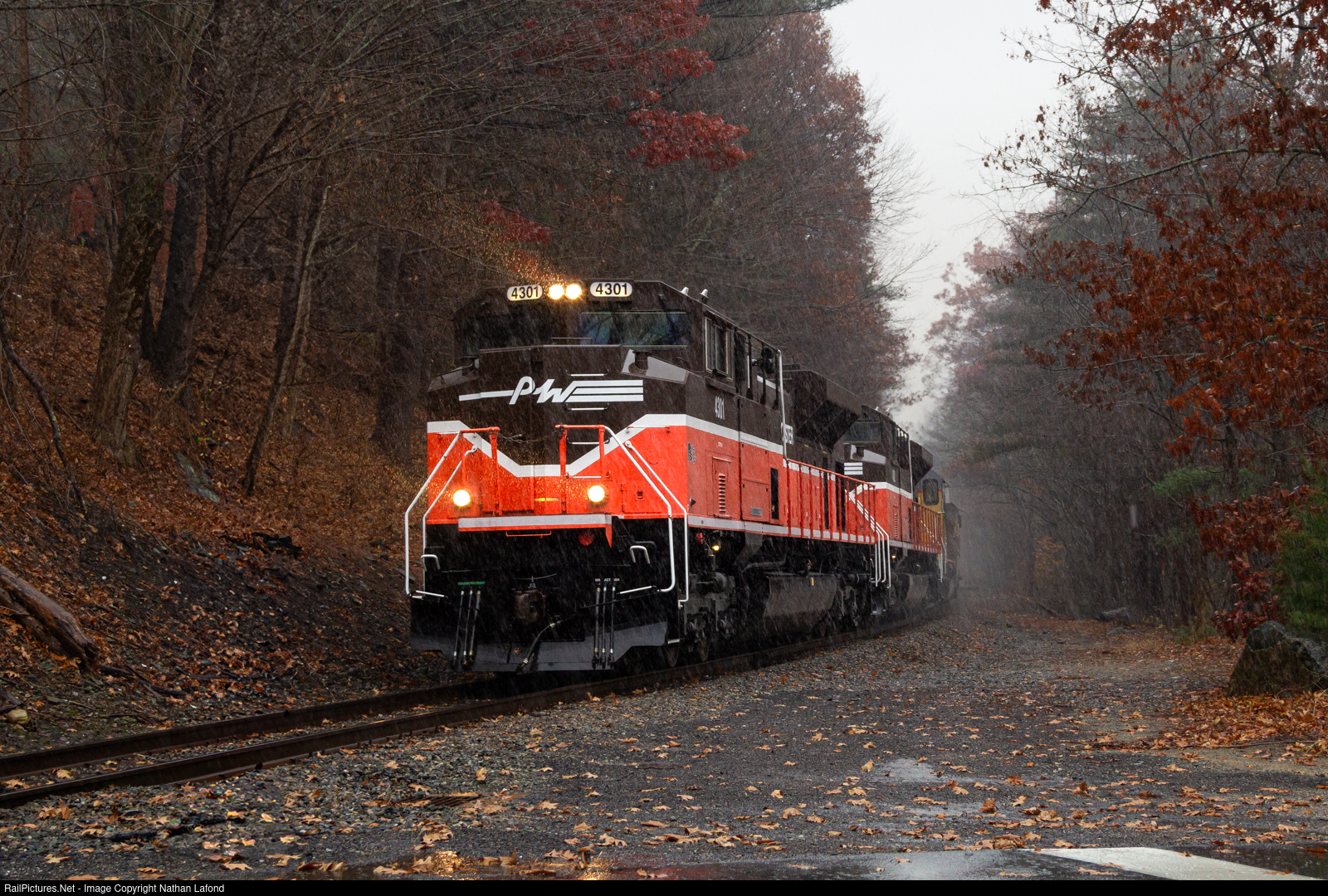 | In nothing short of a downpour, Providence and Worcester’s two big SD70M-2’s lead a pair of NECR SD40’s and a unit train of ethanol though the woods of north eastern Connecticut. |