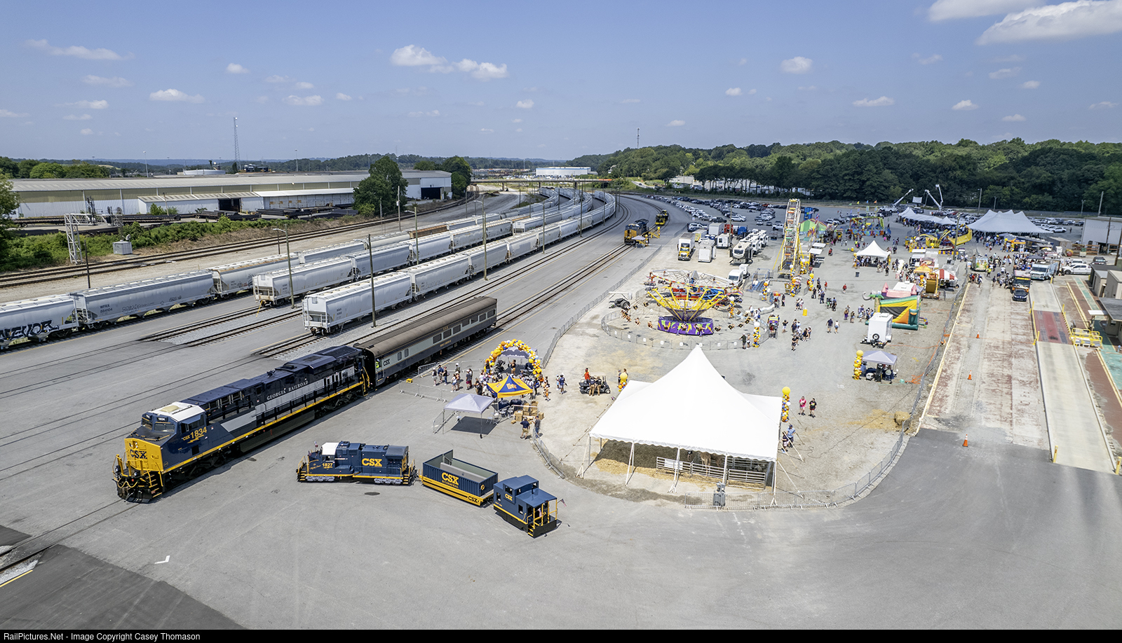 "Family Day" at CSX's Tilford Yard in Atlanta, Georgia, resembled a county fair. They had all sorts of carnival-type rides, a petting zoo, food trucks, games, a locomotive simulator, along with MofW equipment and an ET44AC on display for tours. The highlight (in my opinion) was the "Georgia Road" heritage unit pulling the Prime Osborn business car, which is a theatre car rebuilt from Georgia Railroad coach #106. Rides were offered in the business car, along with the scaled-down Gevo built around a tractor frame towing the miniature intermodal car and caboose. It was a well-attended and impressive event for employees, families, and friends.