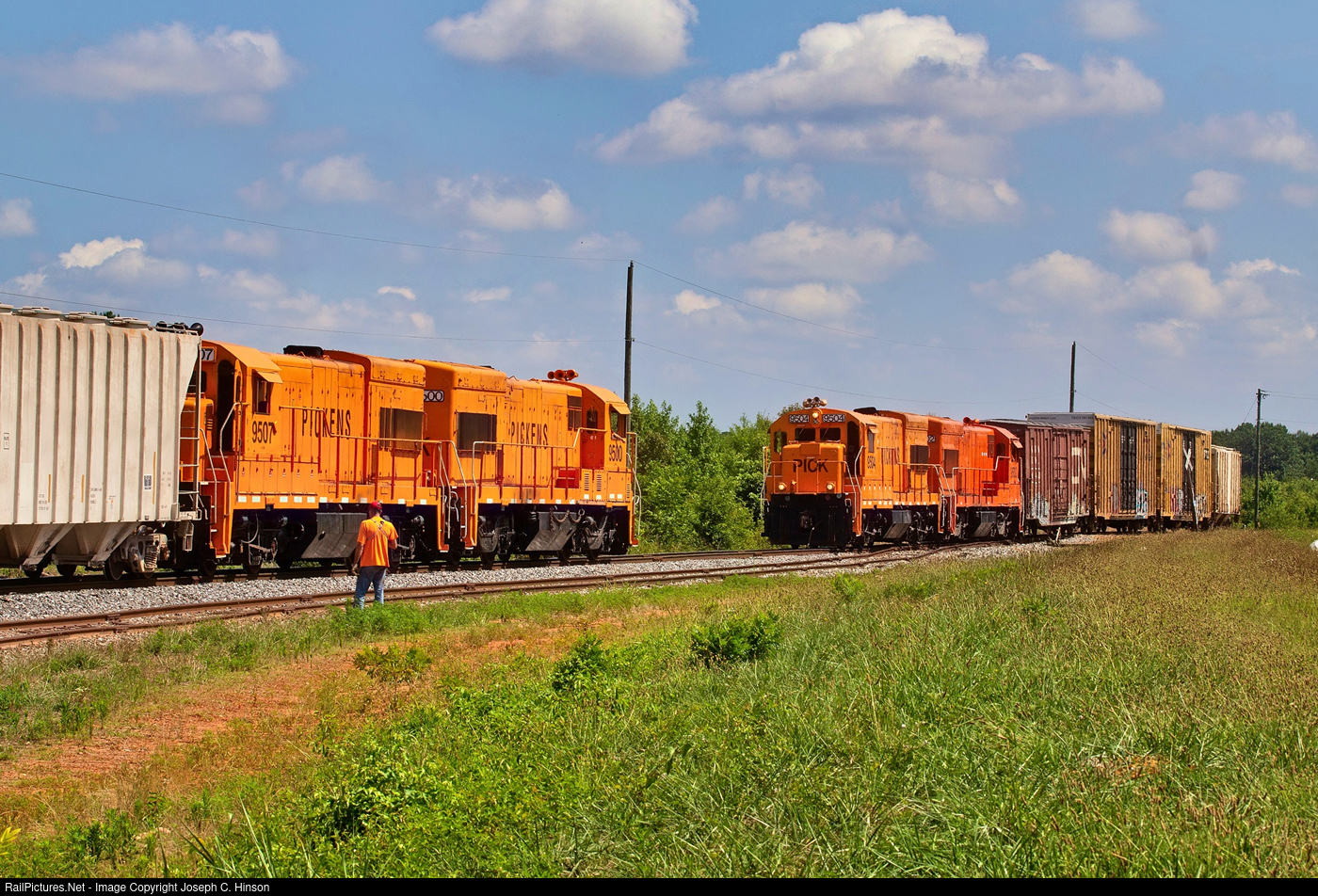 | Two Pickens Railway trains met at Gluck in Anderson, South Carolina. Both trains are sporting classic General Electric U18Bs for power. |