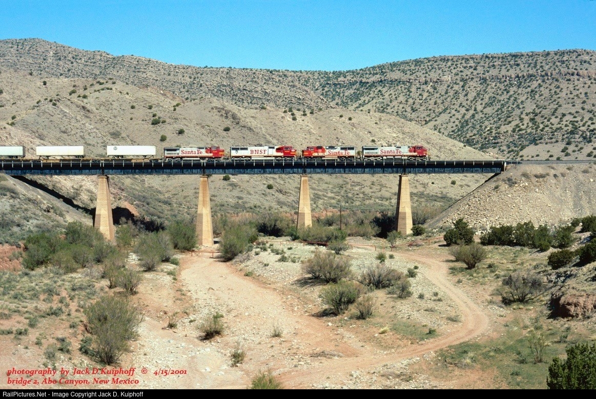 | AT&SF, Santa Fe 670-111-8272-543 with a eastbound on bridge 2, in Abo Canyon, Sias, New Mexico. April 15, 2001. Jack D Kuiphoff © photo |