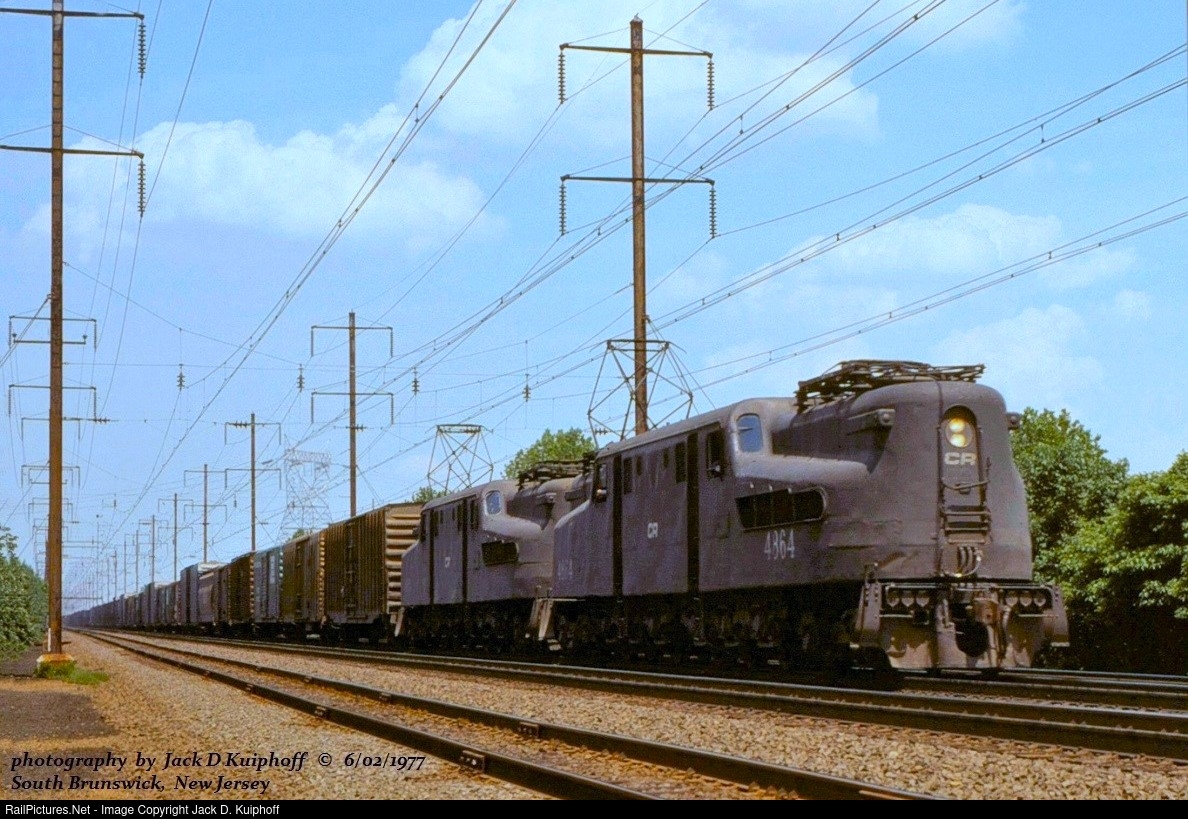| CR, Conrail GG1 4864-4853, leads a southbound/west freight on the Northeast Corridor at South Brunswick, New Jersey. June 2, 1977. Jack D Kuiphoff © photo |