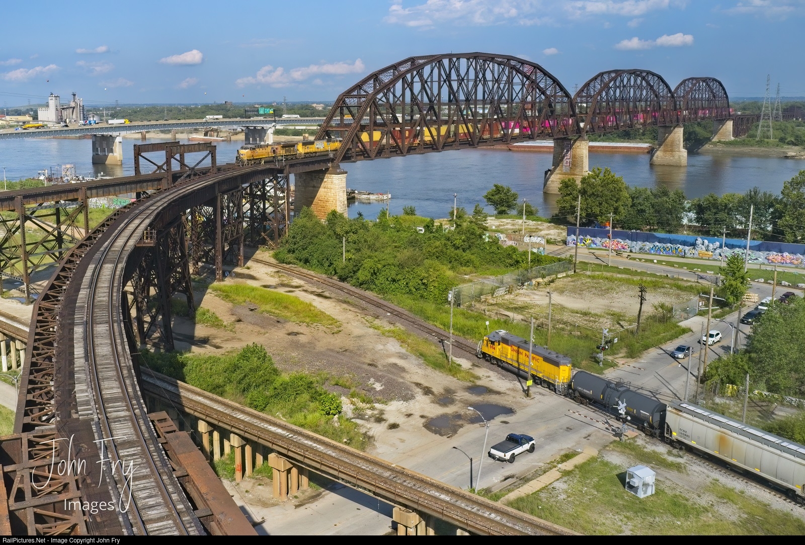 2 in 1! A UP stack train makes its way into St Louis across the massive MacArthur bridge while a yard job with an ex- MoPac loco pulls up for headroom while switching at Lesperance yard below.