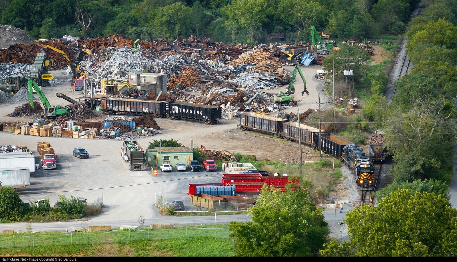 | WW102 works my scrap yard with plenty of material on hand. The stationary shear in the middle left of the yard, still in everyday service, was installed in the mid-1960's and arrived via PRR flatcar while the shredder at the far left is only months old. |