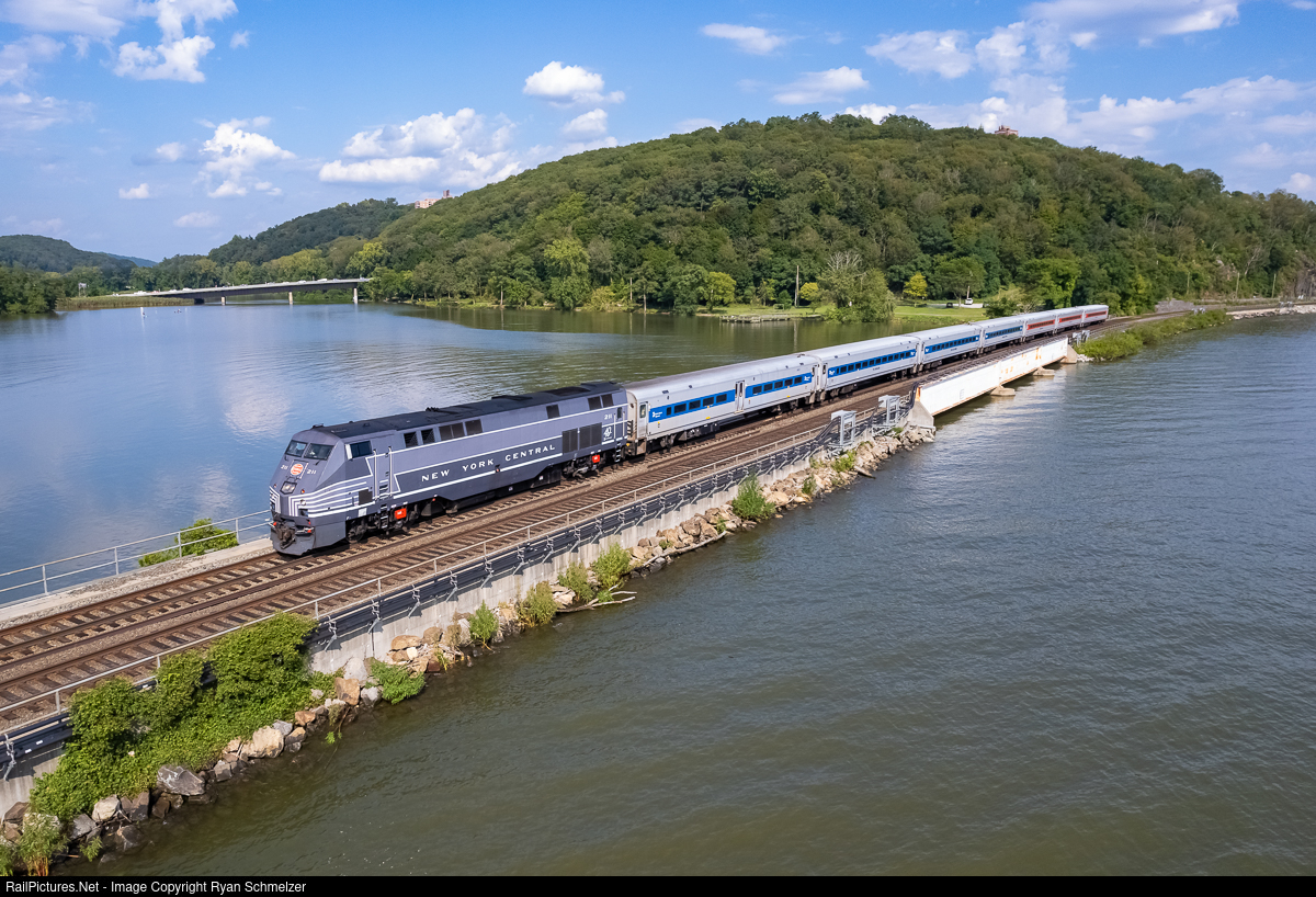 | A Metro-North train to Poughkeepsie crosses the causeway between the Annsville Creek and Hudson River in Peekskill. With the line originally being the New York Central Water Level Route, it was quite appropriate that NYC painted 211 was in the lead. |