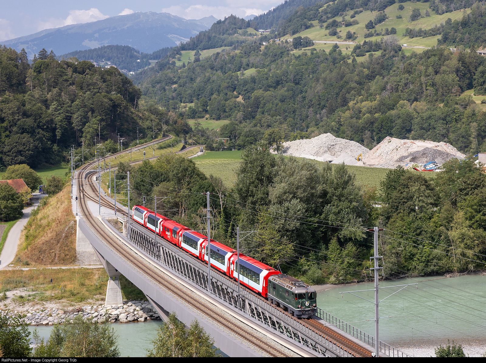 | Ge 4/4 II # 611 of the Rhaetian Railway, first of the series built in 1973, in green color again like it was when delivered, pulls the PE 905 GLACIER EXPRESS from St.Moritz to Chur (-Brig) over the Hinterrhein bridge between Bonaduz and Reichenau-Tamins. |