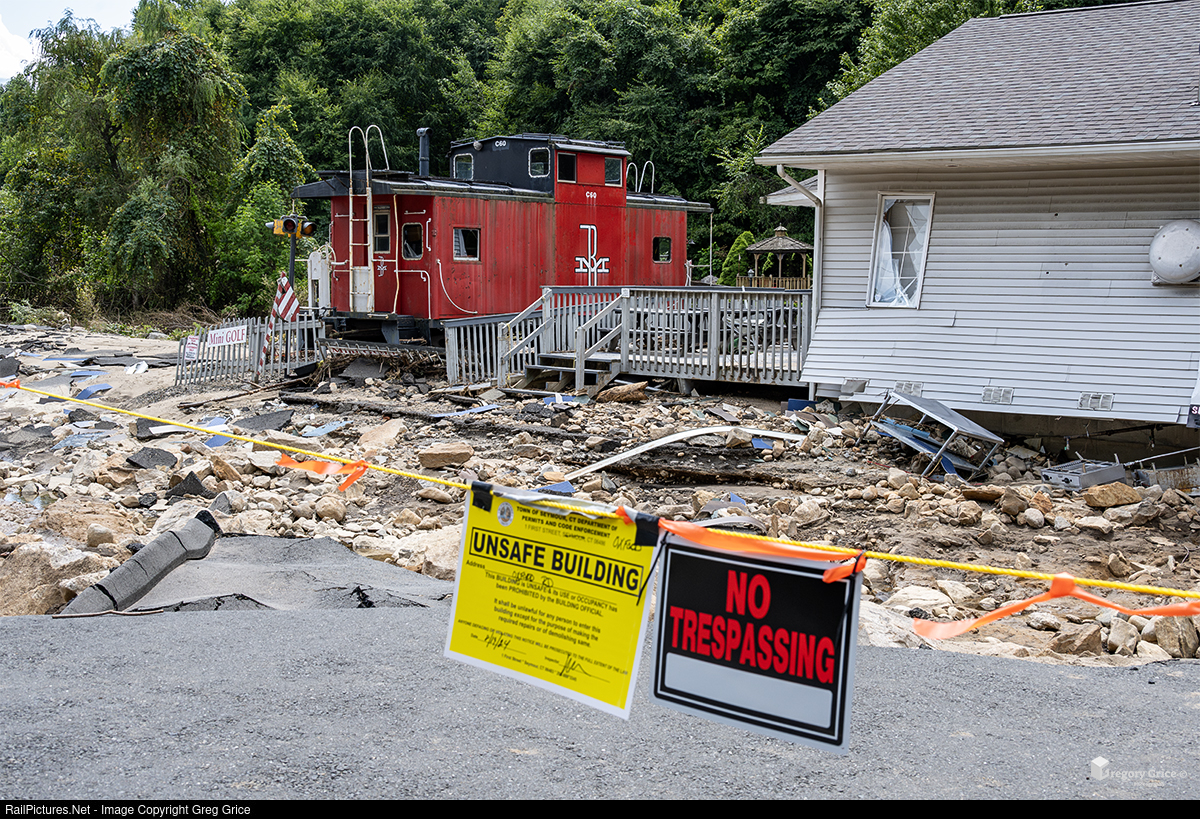 On August 22nd, 2024, Boston & Maine Railroad caboose C-60 sits with the remains of the Olde Sawmill Grill and Miniature Golf Course in Oxford, CT. Unfortunately, the course suffered major damage on August 18, 2024, after heavy rainstorms triggered historic flooding across southwestern Connecticut, forcing its indefinite closure. There is no word yet on whether they will reopen, but the family has set up a fundraiser to assist with cleanup efforts. The link can be found on the course's official website. *This photo replicates the same angle I photographed in September 2021.