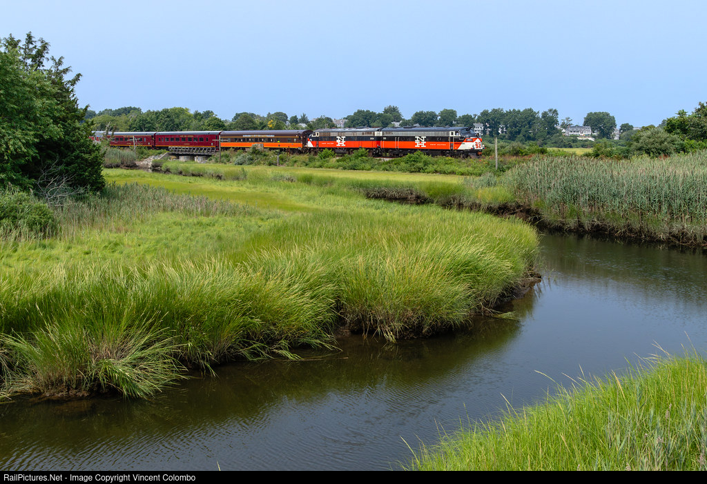 Mass Coastal 2011 and 2026 lead a passenger special at Mill Creek in Sandwich, MA. The two FL9s were paired together for the first time as part of Railfan Day. The train is running southbound from Bourne to Hyannis and is slowing down to pick up passengers at the Sandwich station.