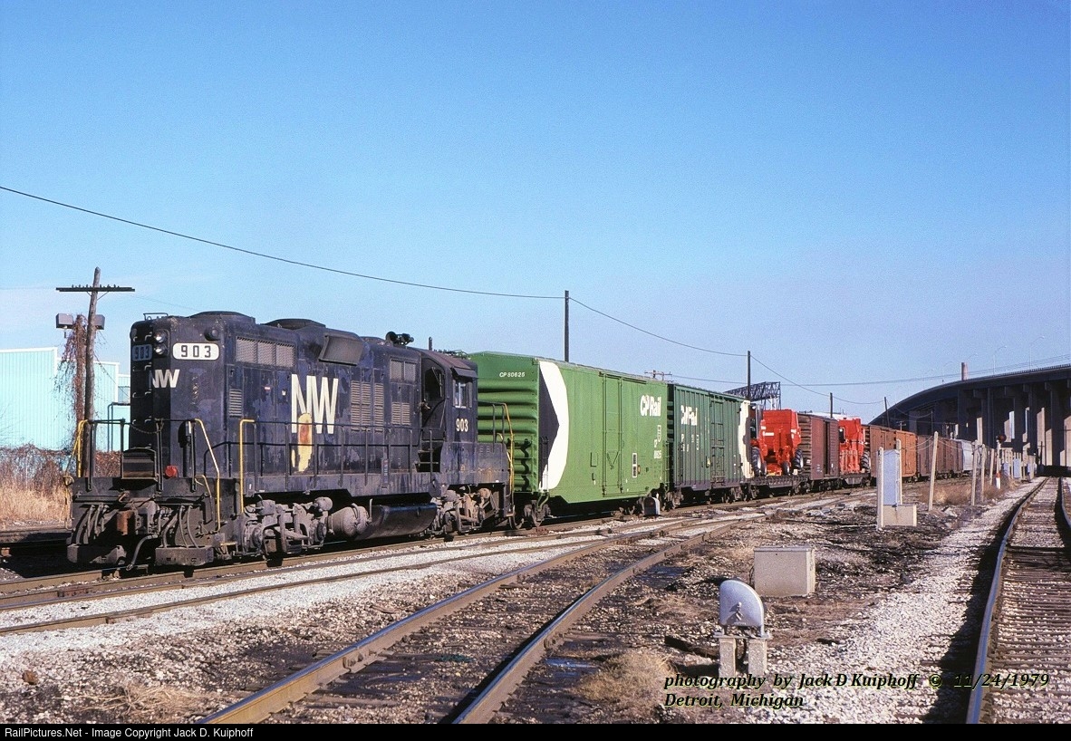 | N&W, Norfolk Western GP9 903, with a transfer train at Detroit, Michigan. November 24, 1979. Jack D Kuiphoff © photo |