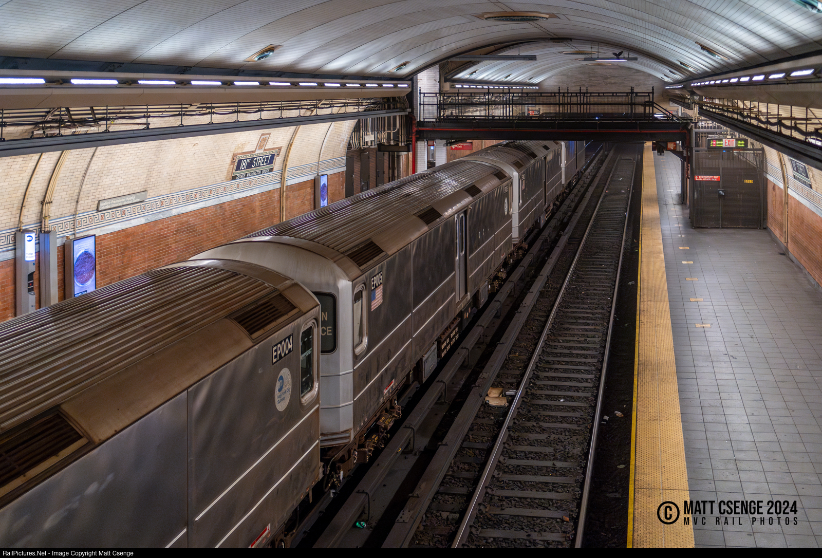 New York City Transit Authority (NYCTA) R134 refuse motor EP017 is seen leading an evening equipment transfer through 181st Street Station on the IRT Broadway-7th Avenue Line, bound for 207th Street Yard. The transfer consisted of four R127 and two R134 refuse motors - a full third of the total fleet: EP017, EP001, EP002, EP004, EP005, and EP015. The two batches of cars were built by Kawasaki in 1990-1 and 1994-6, rumored to be made from leftover R62 body shells, and have been used off and on as motive power for trains collecting refuse from stations - though their lack of air conditioning typically means they are swapped for retired revenue cars during the summer.
