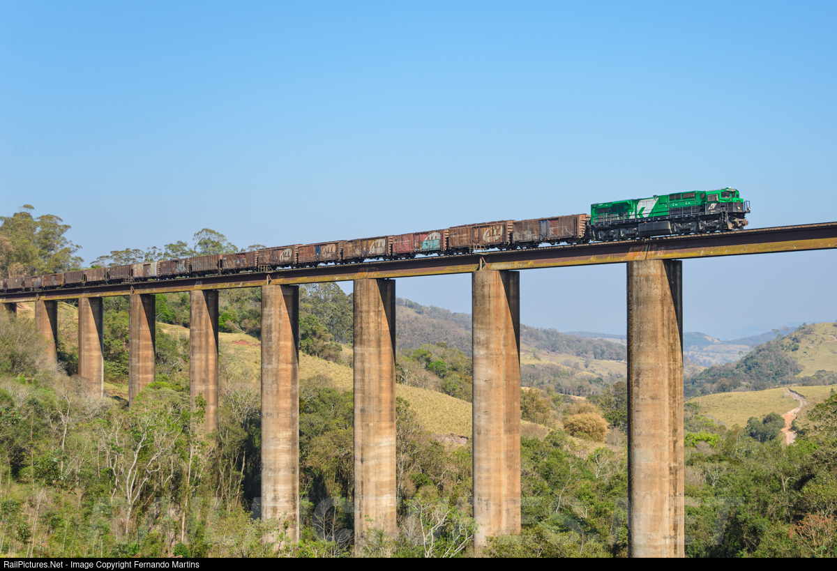 The southbound train bound for the port of Paranaguá is led by Klabin's GE ES43BBi No. 8455 rolling over the Paraná Viaduct at km 497 of the Estrada de Ferro Central do Paraná near Mauá da Serra, PR.