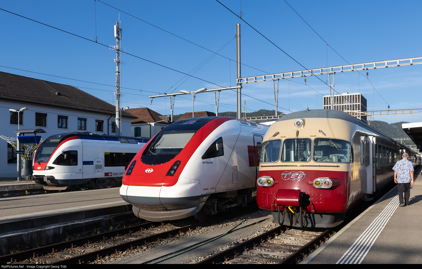Meeting of trains in Delémont. On the left "Flirt" RABe 523 # 004 of the SBB departing as S23 service 17362 from Olten via Basel to Porrentruy. In the middle "ICN" tilting train RABDe 500 # 017 "Willy Ritschard" as IC 1631 of the line IC51 from Biel via Delémont to Basel. On the right TRANS EUROP EXPRESS RAe TEE II # 1053 of SBB Historic from 1961, on the journey for patrons from Basel via Delémont-Moutier-Biel-Solothurn to Olten.