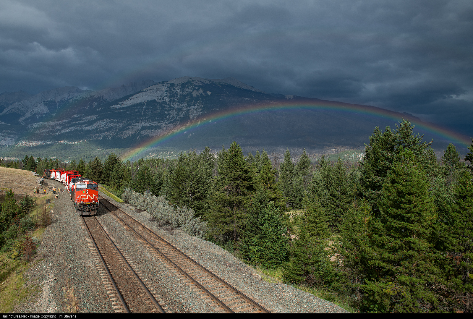| CN's "Trident" and "Neptune" firefighting trains have joined forces east of Jasper and are assisting Parks Canada by pumping water approximately 1km into the bush to assist in fighting the Jasper Wildfire Complex. A much welcomed rain storm had just passed which resulted in a nice rainbow. |