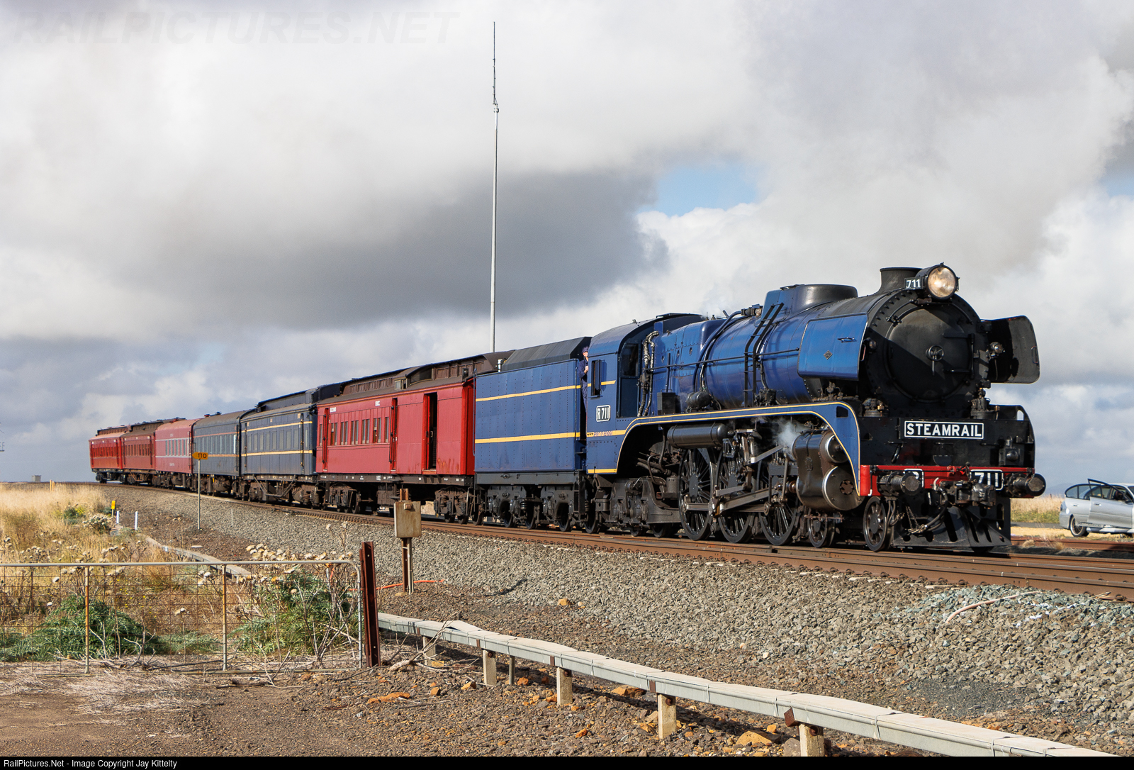Steamrail Victoria's R711 is seen leading the Eureka Express through Ingliston, bound for Ballarat