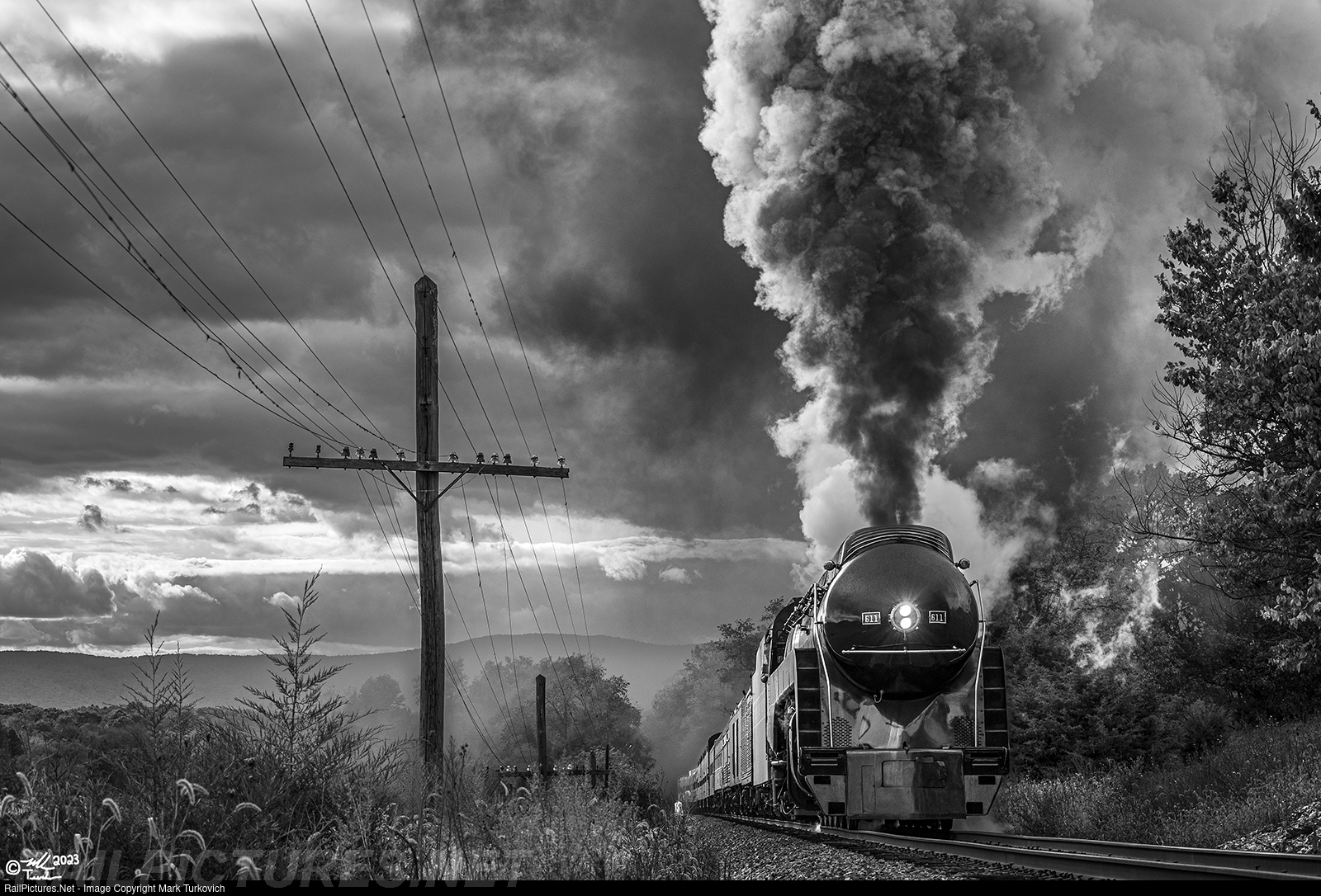 Norfolk & Western 611 charges upgrade at Snyder with its passenger train on a cloudy October afternoon.