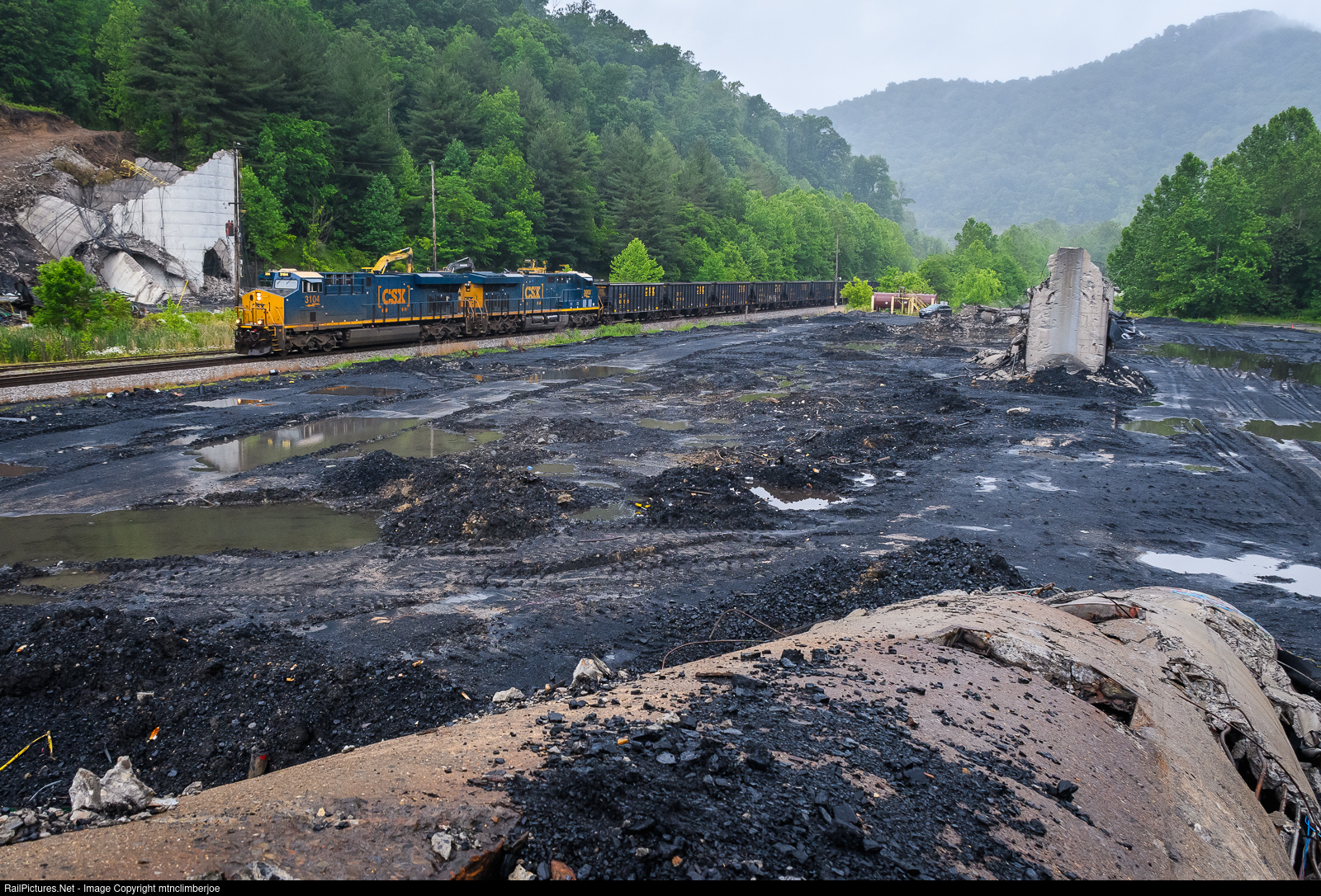 A misty rain fills the sky north of Danville, West Virginia as CSX empty coal train U005 heads towards the yard in town behind a pair of ES44AC's. The train is passing through the remnants of a former coal loadout that is in the process of being demolished to start mine reclamation efforts on the site.