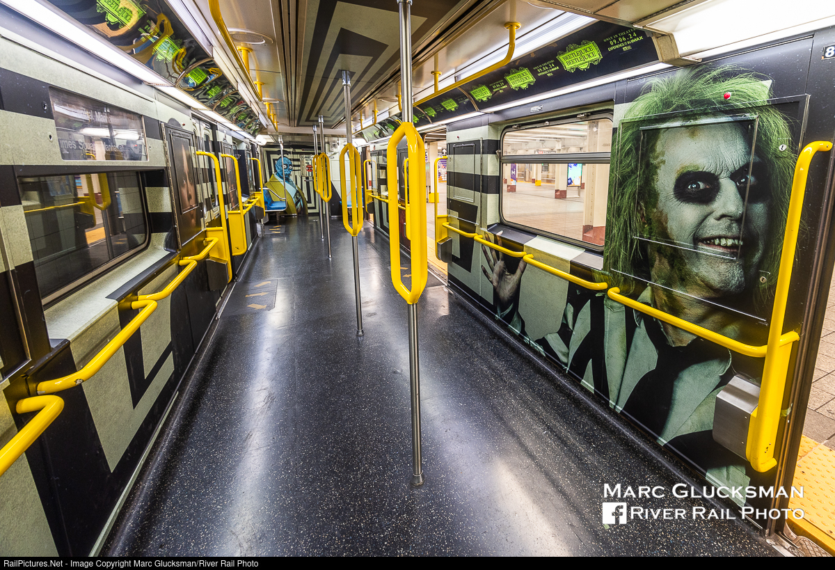 | Don't Say It Three Times. To promote the release of the 2024 Tim Burton directed film "Beetlejuice Beetlejuice", a sequel to the 1988 film "Beetlejuice", a six-car set of MTA NYCT Subway R-62A subway cars were wrapped in a design with the theme of the movie on both exterior and interior. Seen on the Grand Central-Times Square Shuttle on the night of Friday, September 6, 2024. |