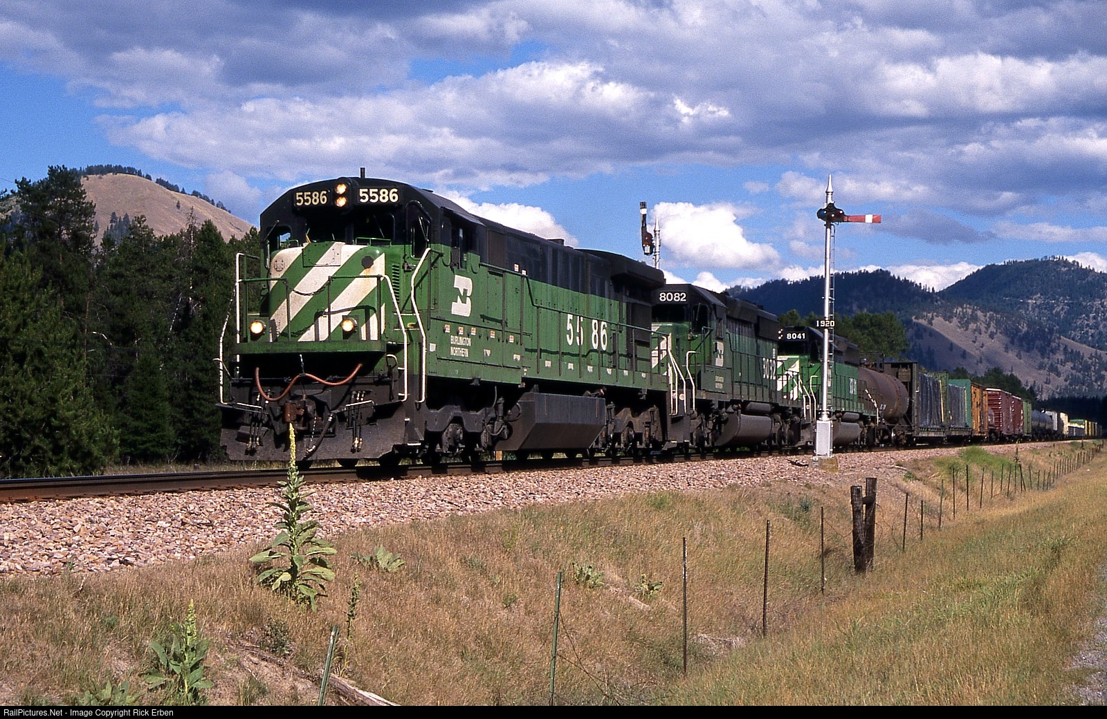 So here comes the 5586 Westbound down the Clark Fork valley between Spring Gulch and St. Regis, MT. At the time, there was a section of track warrant territory between Superior and Paradise, MT that somehow escaped the installation of CTC. As such, semaphores remained along this 35 mile segment into the 21st century. There were also a few pockets of semaphore territory at the time of this photo including portions of the old Erie and Monon, the UP/SP Carrizozo Sub and, of course, the still extant remnants of the Santa Fe system in New Mexico. The Northern Pacific era semaphores date to the 1920s, and the blunt edge blades (as opposed to the typical pointed blade used by NP) were evidently reclaimed from former Great Northern semaphores as replacements where necessary. Fuji Astia