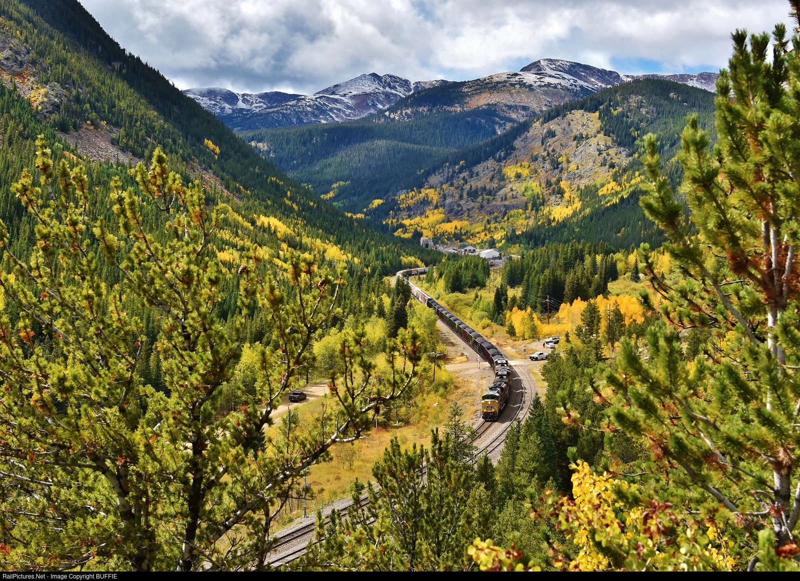 | Snow is falling in the mountains above Rollins Pass as the sun shines on the golden aspen in the Tolland valley below. UP 8944 (D70ACe) leads the Grand Junction to Denver train out of the east portal of the Moffat Tunnel and down the mountain. |