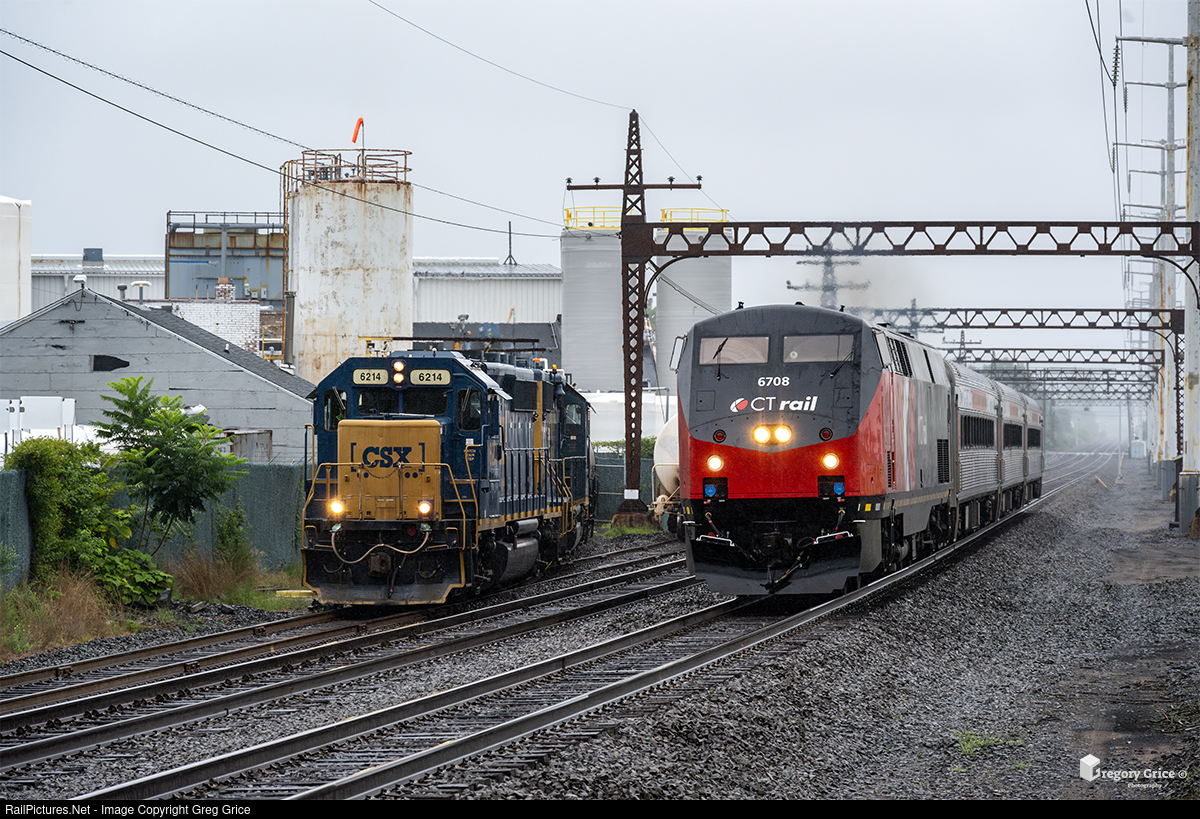 On a misty August 8th, 2024, southbound CTrail Hartford Line train 4405, led by CTrail (CTDX) GE P40BH 6708, passes CSX L017 as they spot cars at Kuehne Chemical Company along the southern end of the MRS (Hartford) Line in New Haven, Connecticut.